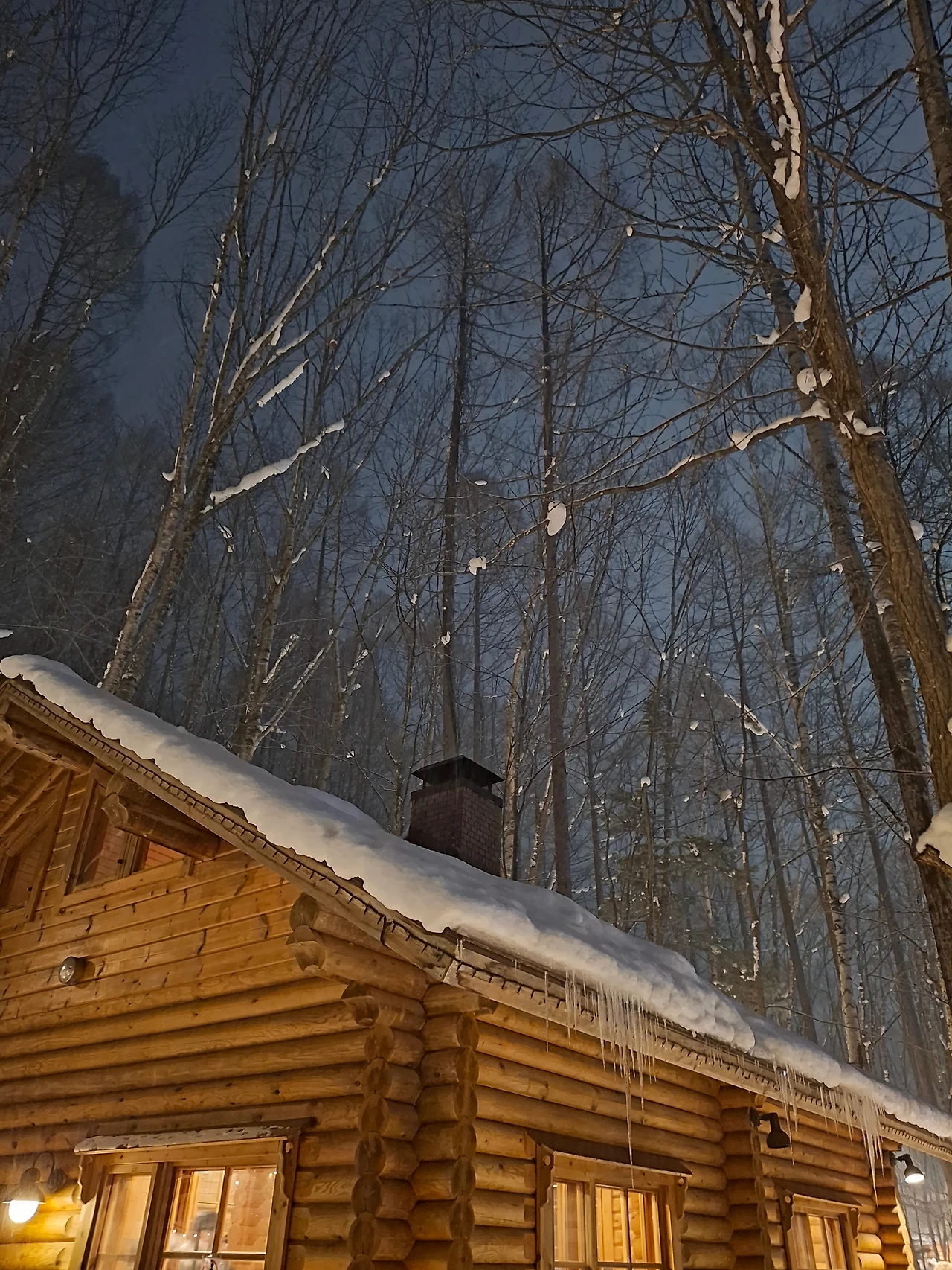 오두막 창으로 흘러나오는 따뜻한 조명,