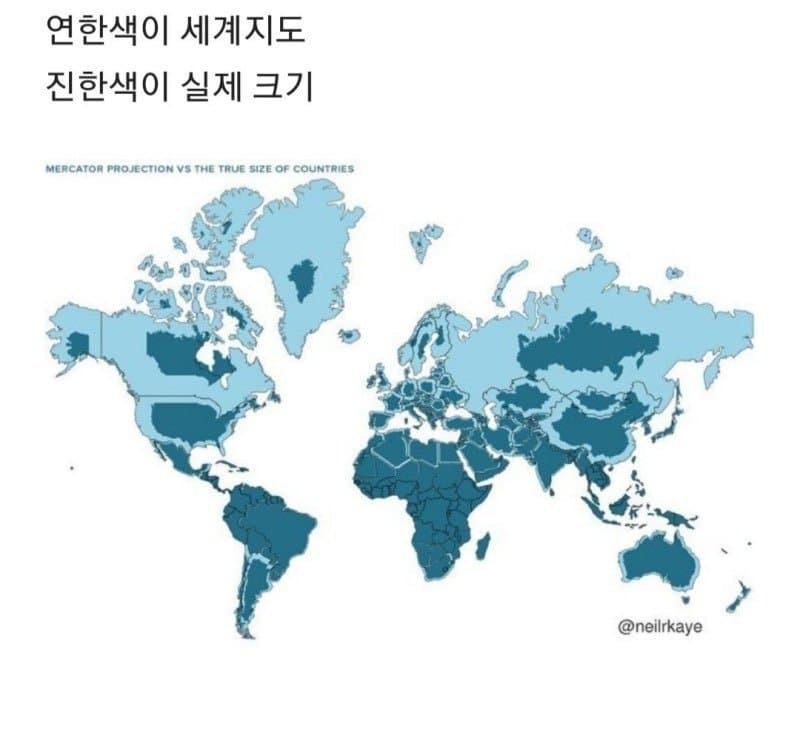 우리에게 매우 친숙한 세계지도로 ‘메르카토르 도법’ 지도가 있습니다. 러시아가 아시아만큼 크고 북아메리카는 아프리카보다 크며 그린란드 섬이 인도보다 커다란 그 지도. 많은 분들이 아시다시피, 이 지도는 육지 면적의 왜곡이 매우 심합니다. 실제 아프리카는 러시아와 남극을 합친만큼 큽니다. 인도는 그린란드보다 1.5배 더 큽니다.