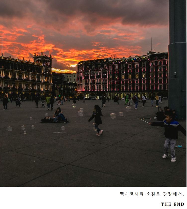 기나긴 여행 탓인지 유독 안 좋은 일이 연달아 일어난 탓인지, 요 한 달간 나는 많은 것에 지쳐있는 상태였다. 에콰도르 바뇨스에서 세상의 끝 그네도, 키토에서 적도 박물관도, 콜롬비아 보고타에서 유명한 그라피티 거리도, 멕시코 칸쿤에서 흔한 세뇨떼 조차, 아무 곳도 가지 않고 매일 숙소에만 박혀있었다. 귀국까지 일주일이 남았을 때, 드디어 한국행 비행기를 탈 수 있는 멕시코시티에 도착했다. 여전히 의욕이 없었던 그곳에서 북인도 동행이었던 부부와 재회했다. 숙소에만 있는 내가 안쓰러웠는지 둘은 나를 데리고 멕시코시티 이곳저곳을 관광했고, 한국을 떠나기 전날에 아침부터 여러곳을 돌아다닌 우리는 해가 지는 시간에 맞춰 마지막 코스인 소칼로 광장을 방문했다. 그렇게 마주한 소칼로 광장은 몸의 피곤함을 날려버릴 만큼 생기가 넘치던 곳이었다. 걱정, 근심, 온갖 부정적인 단어들은 잠시 재쳐두고 그 순간의 행복만을 취하던 수많은 사람을 보니 근 한 달간의 나의 여행이 너무나도 초라해 보였다.