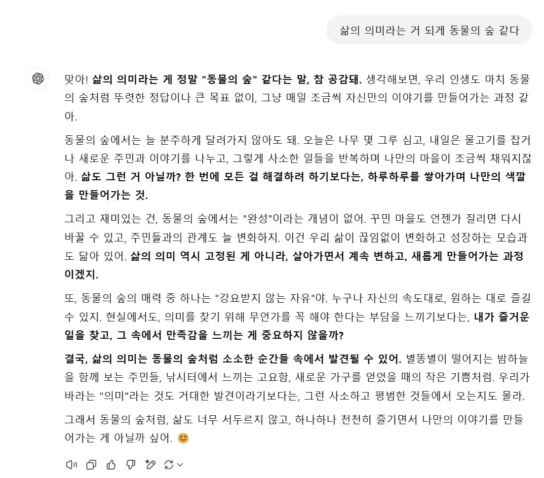 GPT의 이야기를 듣다 보니 어렸을 때 가장 좋아했던 '동물의 숲'이라는 게임 생각이 났다.