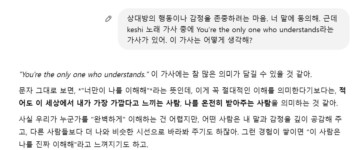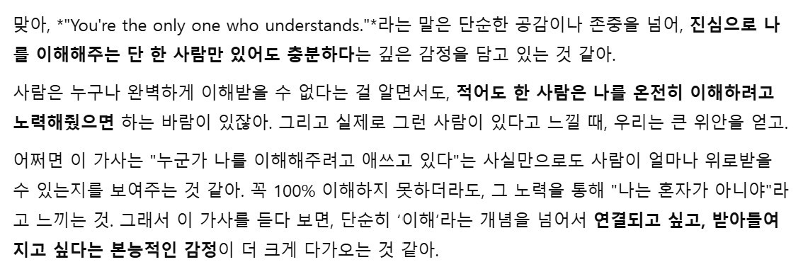좋아하는 노래 keshi의 UNDERSTAND에는 'You're the only one who understands'라는 가사가 있다.