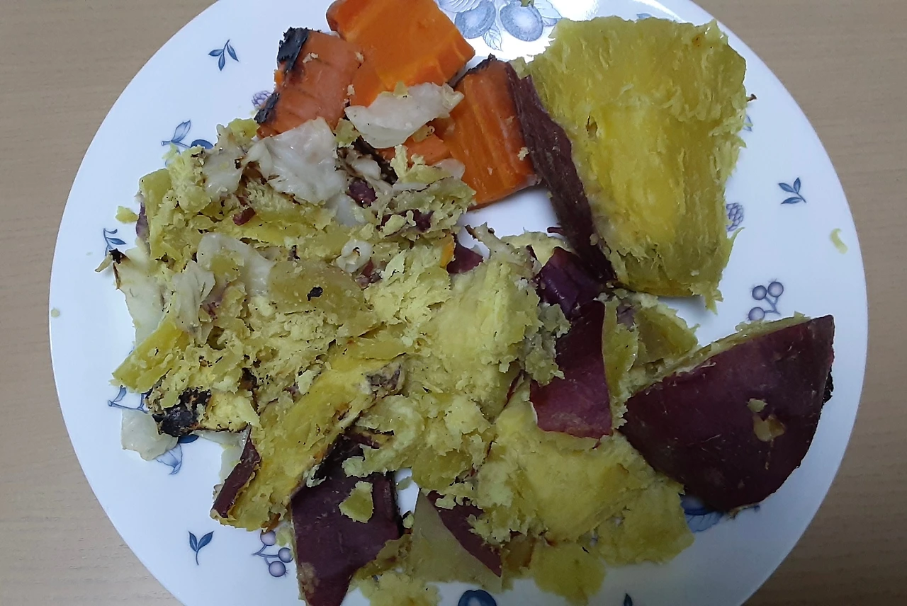 또 태워먹었다. 또 탄내가 난다. 점심에 먹으려고 밤고구마와 당근, 양배추를 냄비에 넣고 찌면서 방에서 일하고 있었다. 타이머를 썼는데도 이 모양, 결국 부엌으로 나와 재빨리 집게를 들고 냄비 뚜껑을 열어 눌어붙으려는 고구마부터 부랴부랴 건졌다. 때깔은 차암 좋은데 덕분에 뜨끈뜨끈한 고구마가 집게의 힘을 이기지 못하고 포슬포슬 부서지고 말았다.