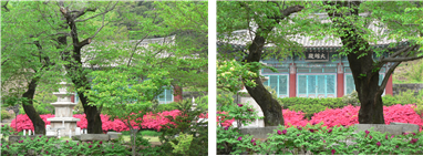 열린 앞마당, 석탑 하나, 멀리 놓인 대웅전 건물. 단출하다. 어제까지 잘 말려서 앞마당에 펼쳐 놓은 잔디가 봄비에 젖어있다. 몇 걸음만 옆으로 옮기면 석탑이 들어왔다가 나간다. 마음에 석탑 하나 들여다 놓는 것이 이렇게 쉽다. 활짝 핀 영산홍이 대웅전을 감싸고 있다.