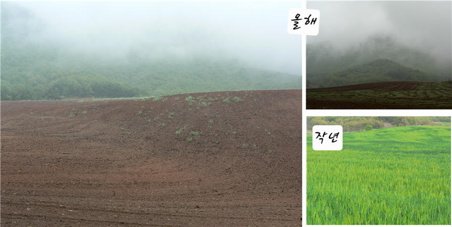 지난해에 이어 다시 찾은 오월의 밭은, 보리가 가득했던 작년의 초록 들판을 기억에서 지운 듯이 잘 손질이 되어 있다. 땅은 흙을 움켜쥐고 있는 나무나 풀들을 키워내기도 하고 거두기도 한다.