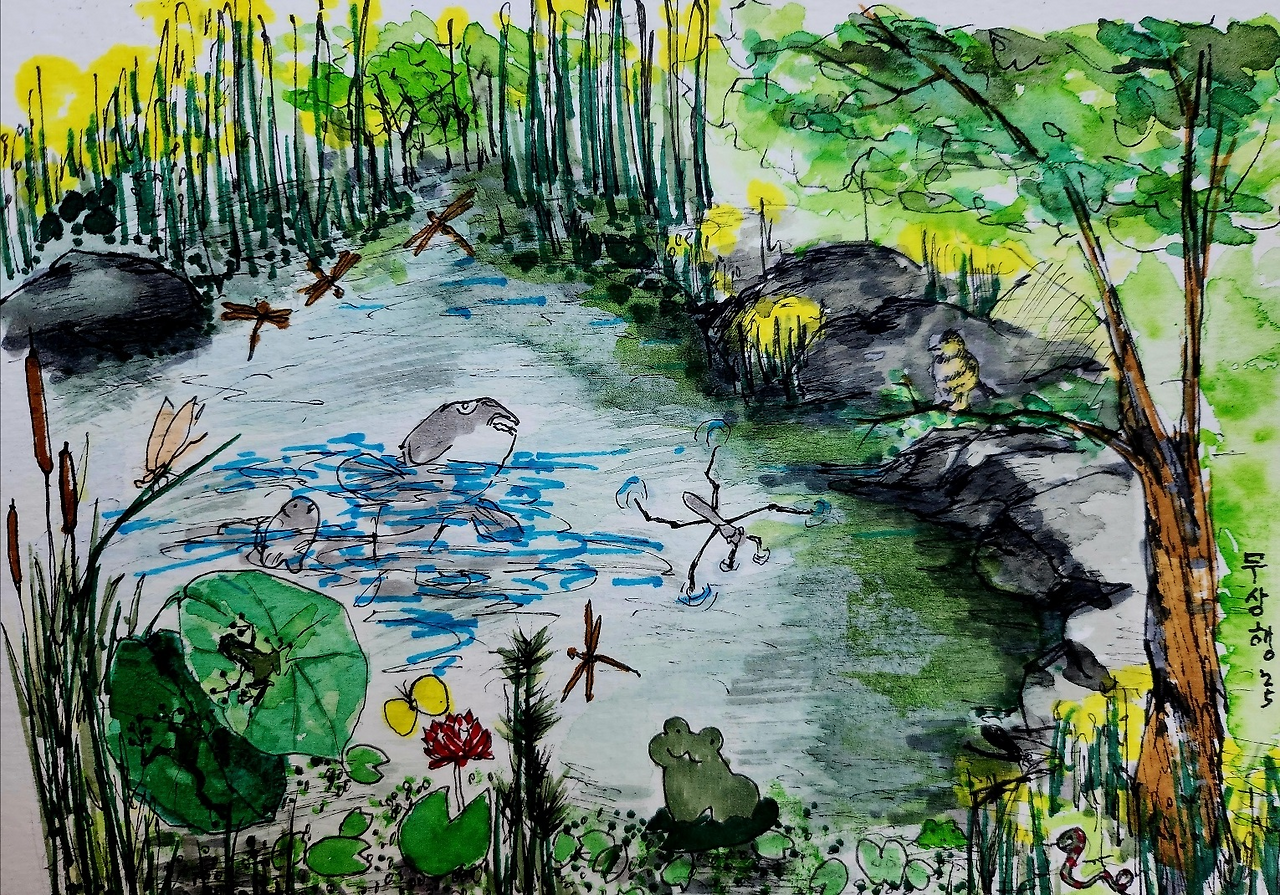 잠자리가 둥글게 둥글게 연못 위를 빙글빙글 도는 오후의 연못, 비친 햇살은 반짝반짝 빛나고, 붕어와 잉어가 물 위로 입을 내어놓고 뽀끔뽀끔 뻐끔뻐끔 대고, 물 위에 떠 있는 소금쟁이가 아른아른 파란 하늘을 사부작사부작 걸어가면, 하늘은 소금쟁이 여섯 개의 다리마다 생긴 동글동글 동심원 물결 속에서 찰랑찰랑 넘치고, 둥실둥실 떠다니는 오돌토돌한 개구리밥 그늘에서 낮게 소곤소곤 대던 청개구리가 폴짝폴짝 뛰며 북적북적 나대니, 근처 물잠자리가 시끄러워 방울방울 물방울 맺힌 미끌미끌한 이끼에는 앉지 못하고, 옹알옹알 대며 다시 날아서, 햇살에 말랑말랑하게 녹으며 부들부들 떠는 애기 부들 지나 아삭아삭한 연잎 위로 올라오니, 흔들흔들 연꽃에 대롱대롱 매달린 나비가 끈적끈적한 꿀에 발 담그고, 연한 순을 오물오물 씹으며 야금야금 먹다가, 두리번두리번 주위를 돌아본 후 하느작하느작 날아 자리를 옮기고, 근처 파릇파릇 풀밭 덤불 아래를 요리조리 살금살금 다니며 먹이를 찾던 박새 무리가, 스르륵스르륵 움직이는 알록달록 꽃뱀 한 마리가 생글생글 웃으며 슬금슬금 다가오는 것을 발견하고는, 허둥허둥 일제히 높은 가지 위로 포롱포롱 날아오른다.