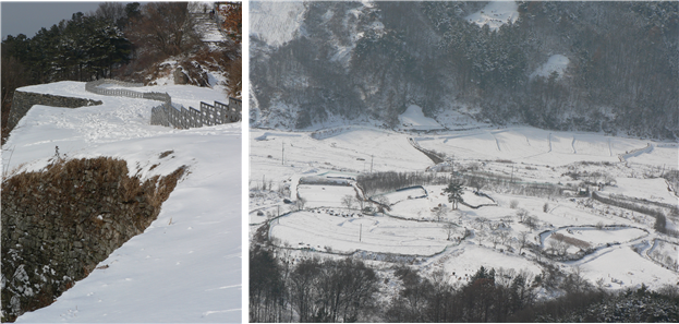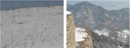 산성에 쌓아놓은 돌 위에서는 눈이 예쁘게도 녹고 있다.