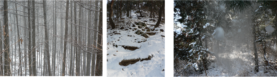 산속 눈의 결계지結界地에 갇혀 나무도 나도 서있다. 이곳에서는 버릴 것도, 채울 것도 없다. 시간이 지날수록 부질없는 상념想念 만 이어졌다 끊어졌다 한다. 산을 넘는 까마귀의 울음소리에 꿈에서 깨어난다. 몸을 추스르고 걷는다. 뽀드득... 눈 밟는 소리를 들으며 산길을 다시 걷는다.