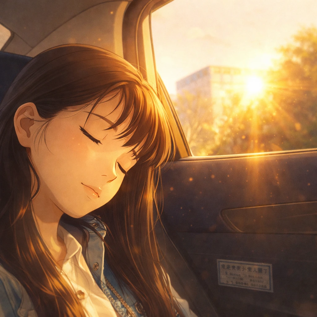 아침, 택시 창문 사이로 스며드는 햇빛이 조용히 하루를 깨운다.