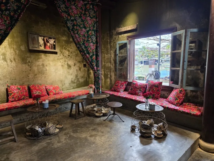좌석 시트 색과 무늬하며 벽과 바닥, 창문, 커튼 모든 것이 빈티지스럽고 낭만적임