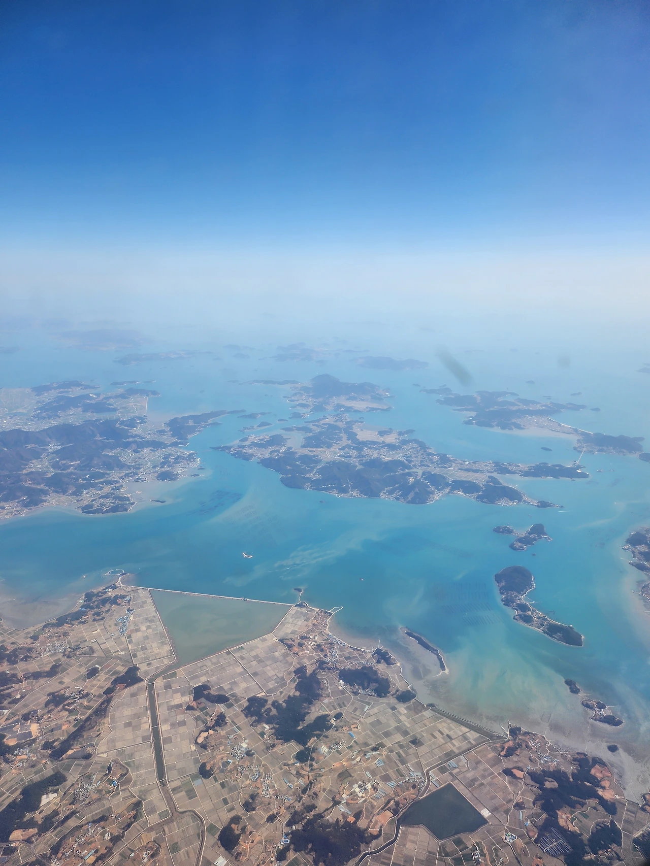 그리고 제주도로 가는 비행기 안에서 운 좋게 볼 수 있었던 남해, 서해 어디쯤일 것으로 보이는 섬과 바다까지..