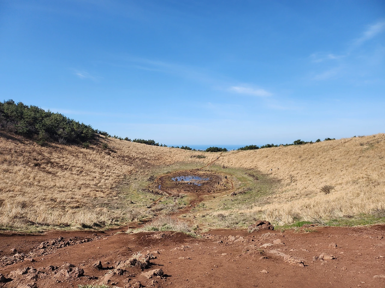 제주도가 화산섬이라는 것을 해안가나 돌담에 현무암으로만 느끼다가 오름에 오르니 더 직접적으로 다가왔다. 움푹 패인 오름의 분화구 지형이 여느 다른 언덕이나 산 꼭대기와 다른 모습이라 인상적이었다. 산은 꼭대기가 좁은데 오름은 꼭대기가 넓게 패여있으니 안정적인 느낌이 있었다.