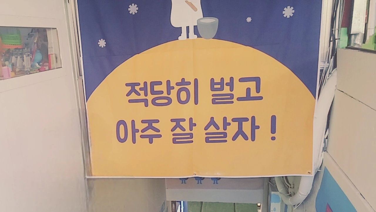 '적당히 벌고'라는 말이 썩 맘에 들지 않아 '풍족히 벌고' 뭐 이런 부자 느낌으로다가 말을 바꾸고 싶었다. 신혼 극 초기에 전주에 가서 처음 본 인상적인 문구였다. '아주 잘 살자!'라는 말만큼은 꼭 이루고 싶었는데, 벌써 10년이 지났다. 이렇게 그때를 미소로 추억하며 글을 쓰고 있으니 잘 살고 있는 건 맞는 듯하다.