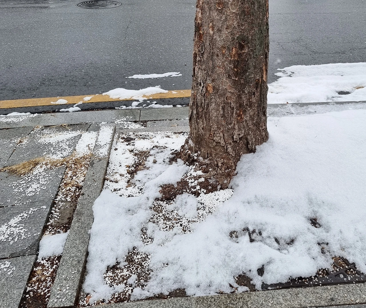 보도블록에 쌓인 염화칼슘과 가로수 아래 쌓여있는 염화칼슘을 치워달라고 했다.
