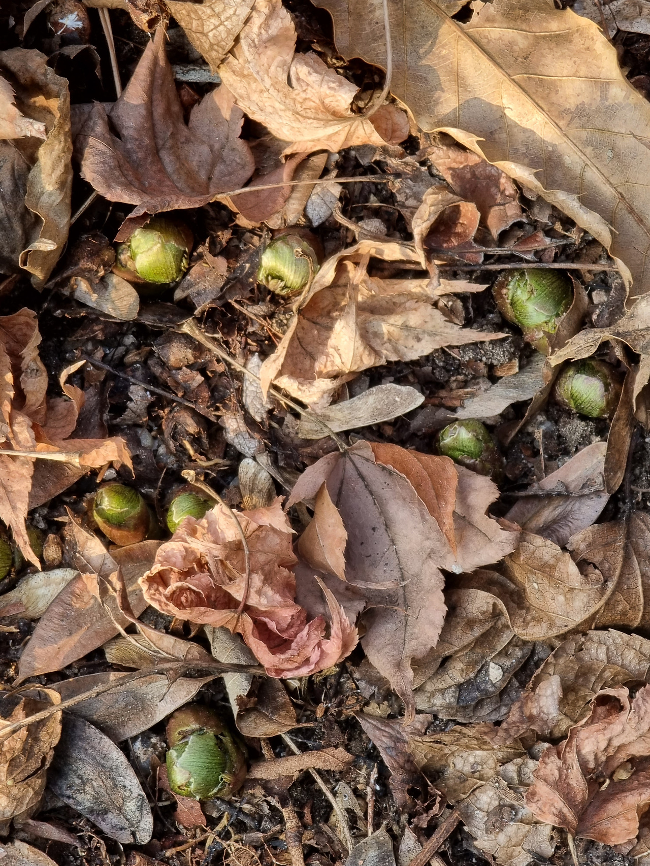 복수초 옆에는 길마가지와 산가막살나무, 수수꽃다리가 뚱뚱한 꽃눈을 키우고 있다.