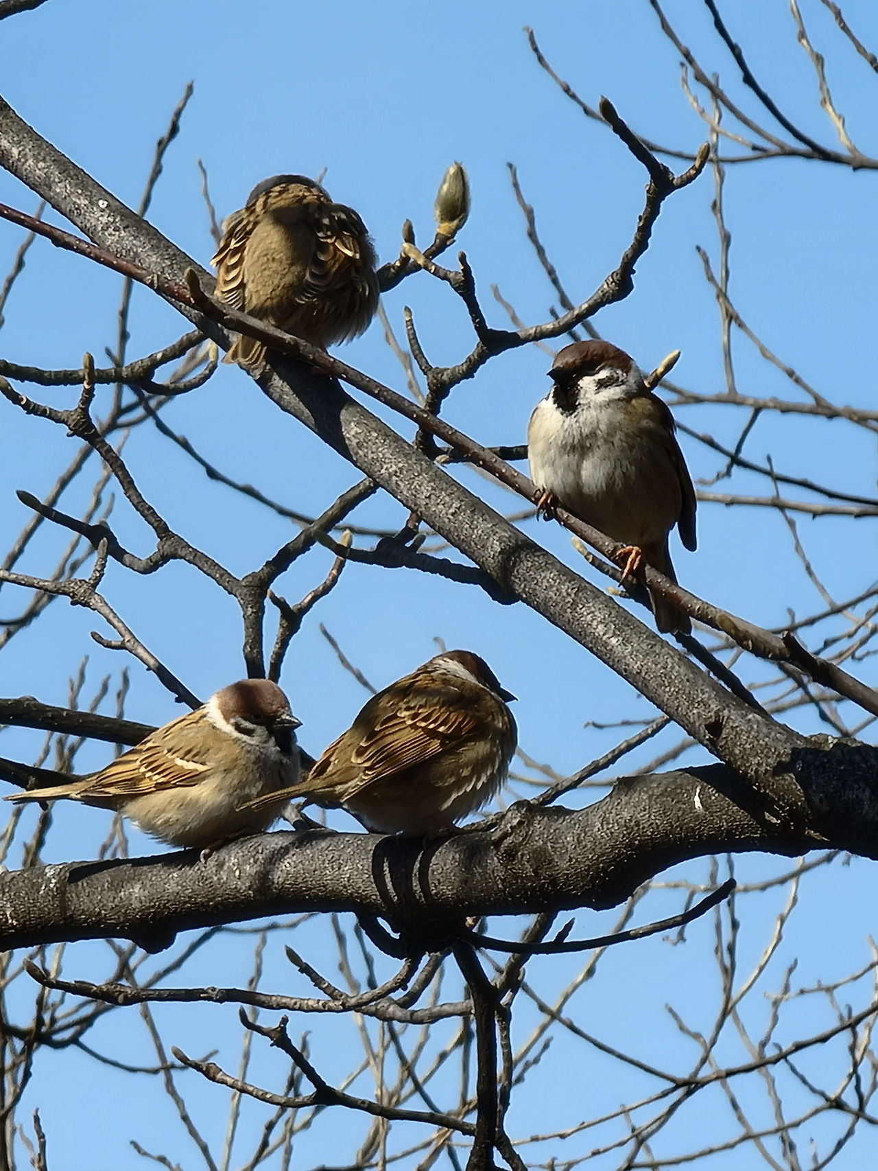 아직 검불이 덮여있는 속을 뒤적거리며 먹이를 찾는 참새들이