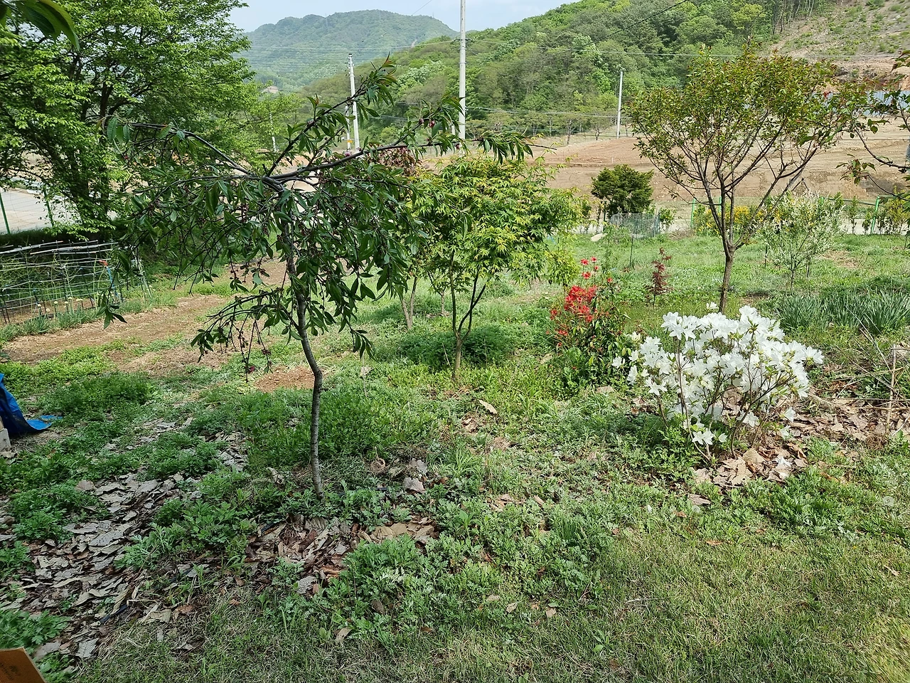 그 사이 너무 변하여 깜짝 놀랐다. 동네에 집들이 다 들어와 버린 것이다. 입구에 친구네 땅만이 놀이터로서의 역할을 충실히 하고 있었다. 건너편 멀리도 집들이 들어오려고 계단을 만들고 길도 다져져 있다. 사람들이 야생화를 왜 캐가는지 모르겠다고 한다. 그리고 고라니들이 맨날 들어와서 야채들을 키울 수가 없어 철조망을 높이 쳤더니 고라니한테 미안해 죽겠다고 한다. 뒤편이 산이라서 그곳에 고라니가 살고 있다. 그런 곳에 부동산업자들이 와서 맨날 팔지 않겠냐고 말한다고 한다. 너무 속상하다고 한다. 천 평의 땅에는 정말 원시적인 모습 그대로이다. 무계획적이고, 자연 친환경적이다. 사과나무가 있고, 단풍나무가 있고 철쭉이 있고 아로니에 가 있고 주목이 있고 정말 가짓수가 셀 수 없는 종류들이 다 아무 곳에나 심겨 있다. 어림잡아도 50가지도 넘을 듯했다. 그것들이 정말 어수선하게 심어져 있는 것을 바라보며 스스로 행복해했다.