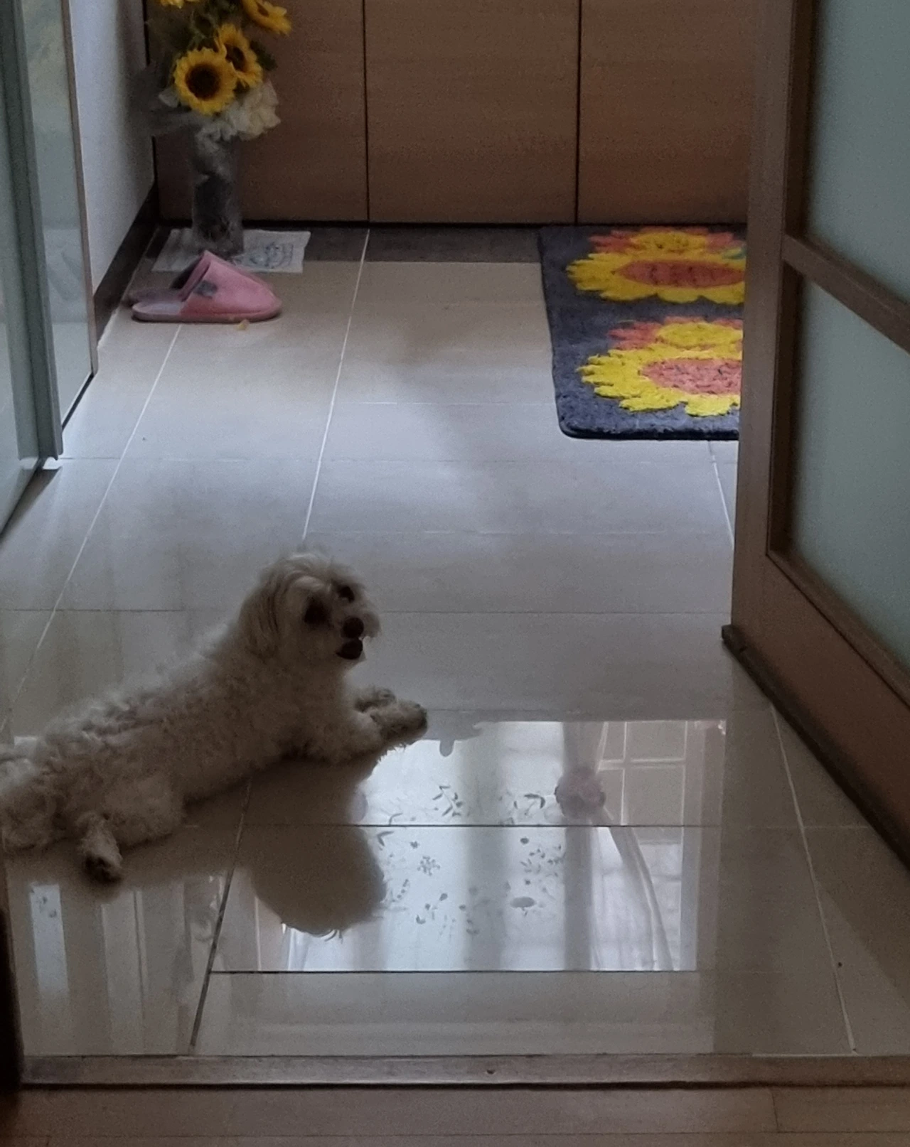 그렇게 활발하게 뛰어다니며 온갖 간섭을 다하더니 요즘은 동작이 느려지고 둔해졌다. 더위 죽겠나 보다. 현관 타이루 바닥에 누워있기도 하고 화장실 바닥에 들어가 자기도 한다. 그래도 안에서 뭐하는지 궁금한지 머리만큼은 거실 쪽으로 내밀고 누워있다.
