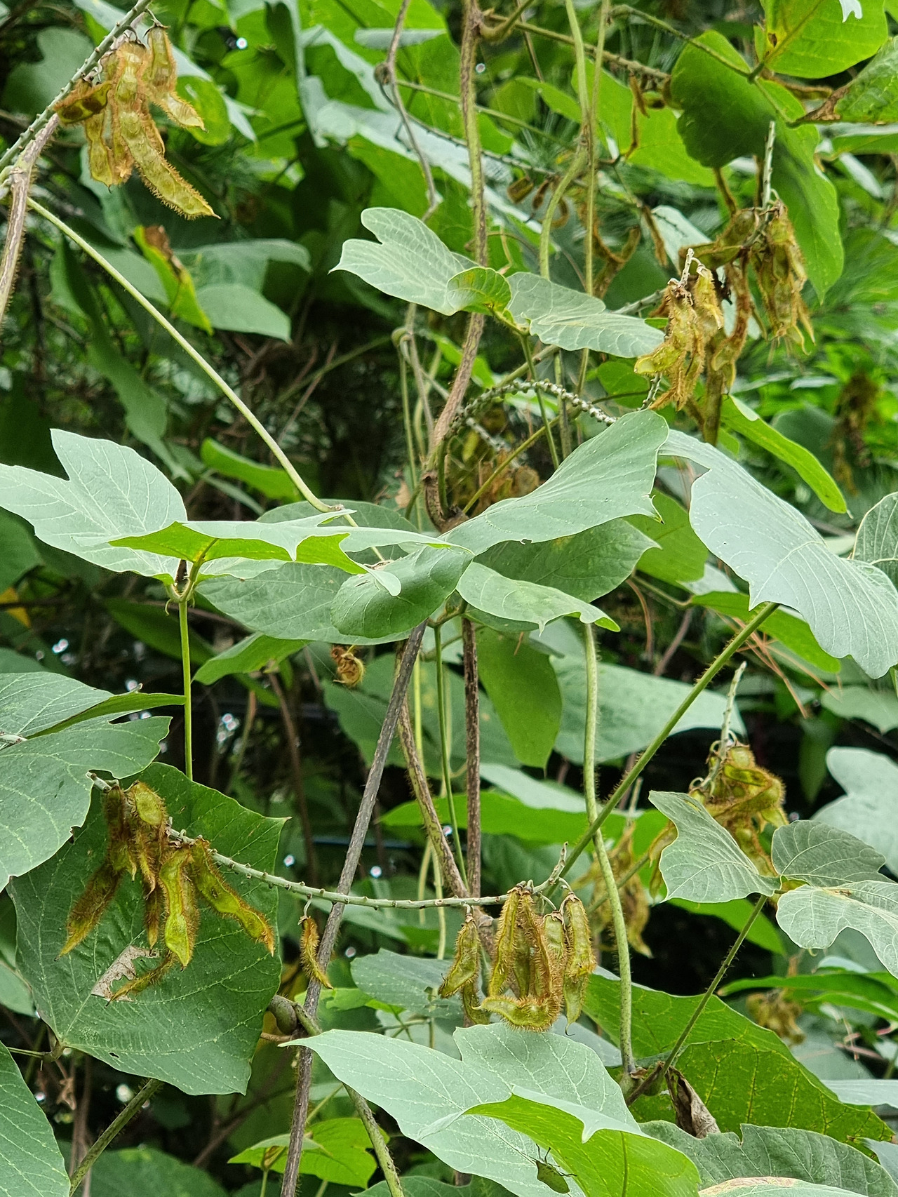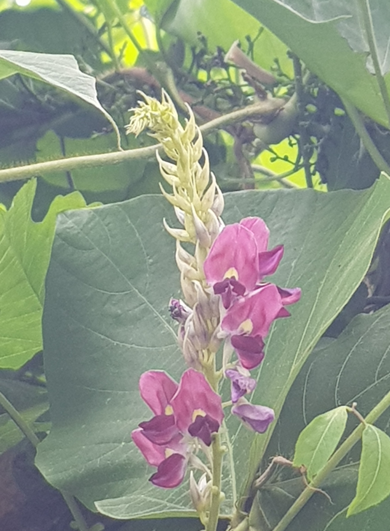 전에는 등산로 입구 트럭 위에 앉아 지나가는 사람들에게 숙취에 좋다고 손짓하곤 했다. 커다란 뿌리에서 직접 짠 칡차를 한잔씩 마시며 산에 올라가는 즐거움이 있었다. 칡도 꽃이 있냐고들 한다. 커다란 잎사귀 속에 아름다움을 살짝 숨기고 향기를 품어낸다. 잎겨드랑이 사이에 원뿔모양의 꽃차례에 짧은 꽃자루가 달린 붉은 연보랏빛 꽃이 모여 있다. 가을이 되면 열매는 갈색 털을 잔뜩 단 꼬투리 안에 강낭콩 같은 콩알을 넣고 매달려 있다.