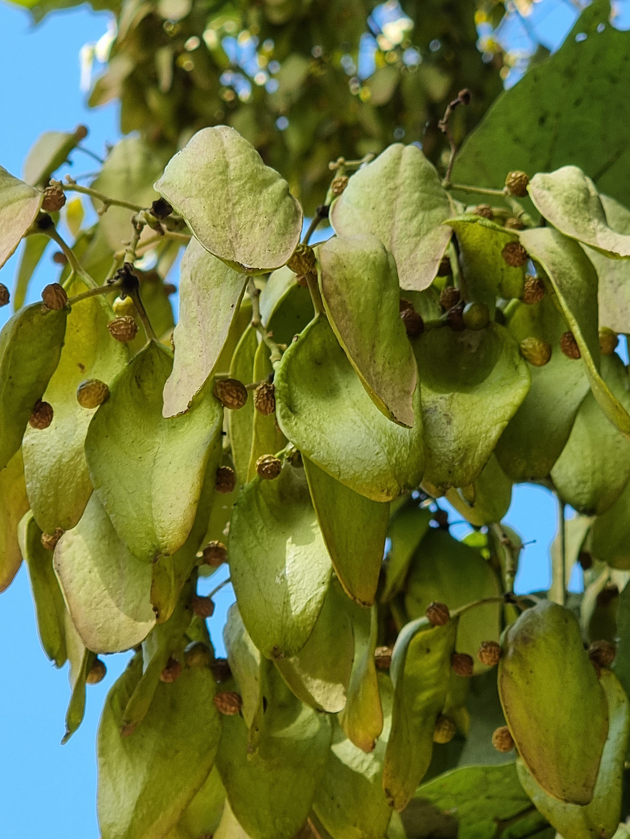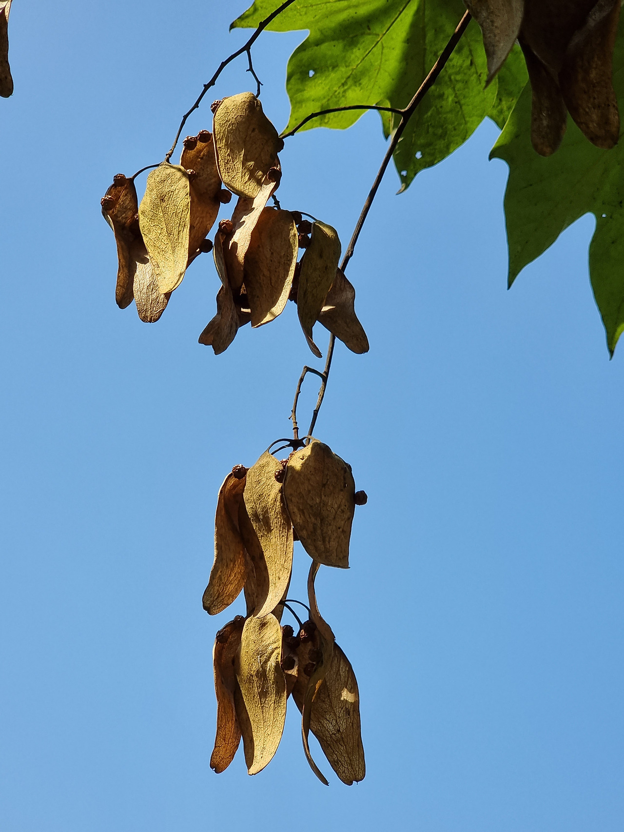 열매도 오동나무와는 달리 손을 가운데로 모은 것 같기도 하고, 숟가락 모양 같기도 한 가장자리에 콩알만 한 씨가 서너 개씩 붙어있다. 열매껍질 모양도 독특한 것이 안에 씨를 품고 있다 벌어진 것이다. 씨를 볶아서 커피 대용으로 먹으면 구수한 냄새가 일품이다. 잎, 껍질, 꽃, 열매 등 어느 것 하나 버릴 것 없이 다 약재로 사용되기도 한다.