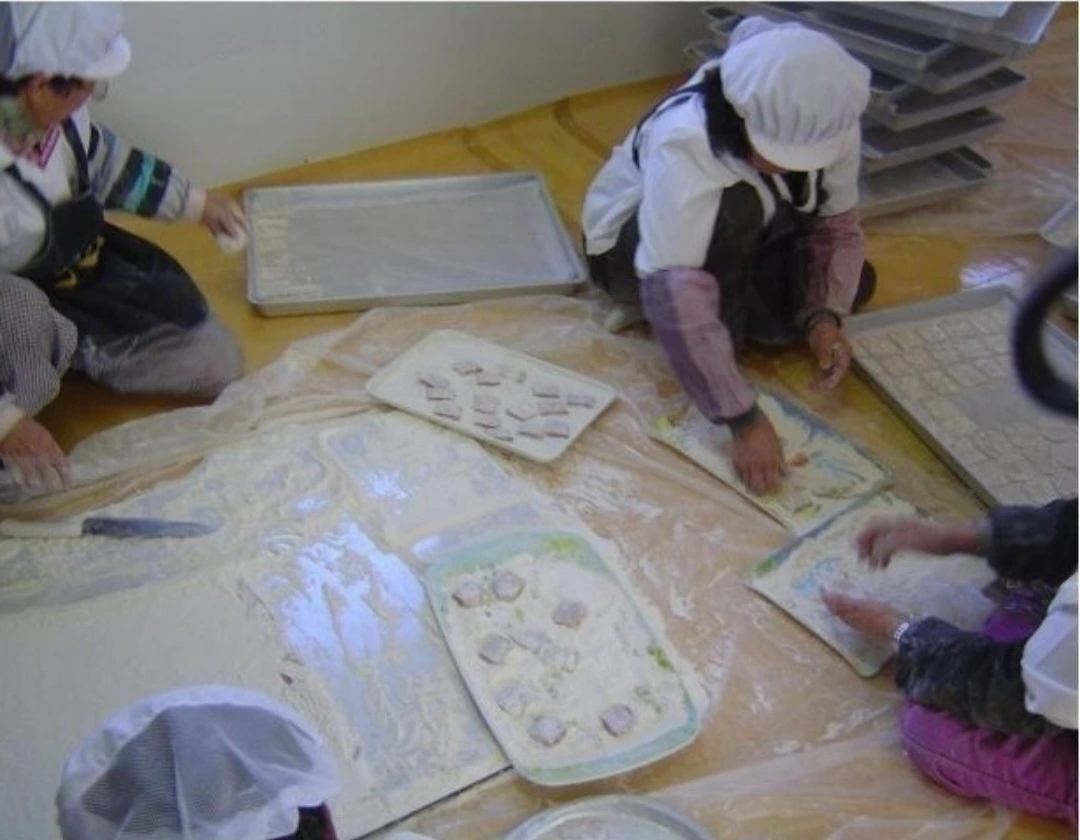 요즘은 귀한 간식인 산자와 강정을 따뜻한 방에 둘러앉아 제일 먼저 만들기 시작했다. 한쪽에서는 밀고 당기고 기름에 튀기면 커다랗게 만들어져 나온 하얀 산자를 쌀 튀김에 버무려 큰 광주리 몇 개에 가득 담아 시원한 광으로 옮겨 간다. 그리고 어느 날은 밀가루를 얇게 밀어 직사각형으로 만들어 가운데에 칼집을 내어 뒤집어 기름에 튀긴 후 꿀을 발라 타래과를 한 바구니 만들었다. 가장 맛있는 것은 모찌였다. 지금도 난 모찌를 잘 사다 먹는다. 맷돌에 콩을 갈아 간수를 넣어 두부를 만들면 얼마나 맛있었는지 모른다. 시원한 물에 담가 둥둥 띄어두면 위에 살짝 살얼음이 올라와 있었다. 힘들었지만 맛있는 명절음식들이 한가득 차려지면 피곤도 잊고 즐겼던 시절이었다. 요즘 그런 얘기를 하면 먼 옛날 소설 속의 풍경 같다고 한다.