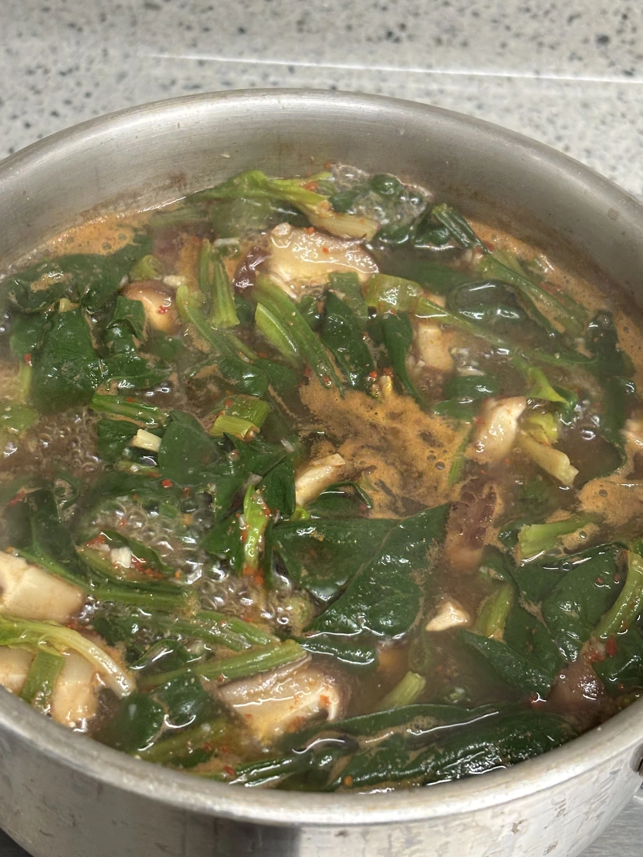 시금치의 꼭지를 자르고 이파리 사이에 흙이 껴있을 수 있으니 잘 흔들어 씻는다. 코인 육수와 간 마늘 넣고 물을 끓인다. 된장을 채에 받쳐 풀고 한소끔 끓어오르면, 씻어놓은 시금치와 표고버섯, 파를 넣고 은근한 불에 끓인다. 고춧가루를 조금 넣는다. 파랗던 시금치에 된장 물이 들면 국이 왼성된다.