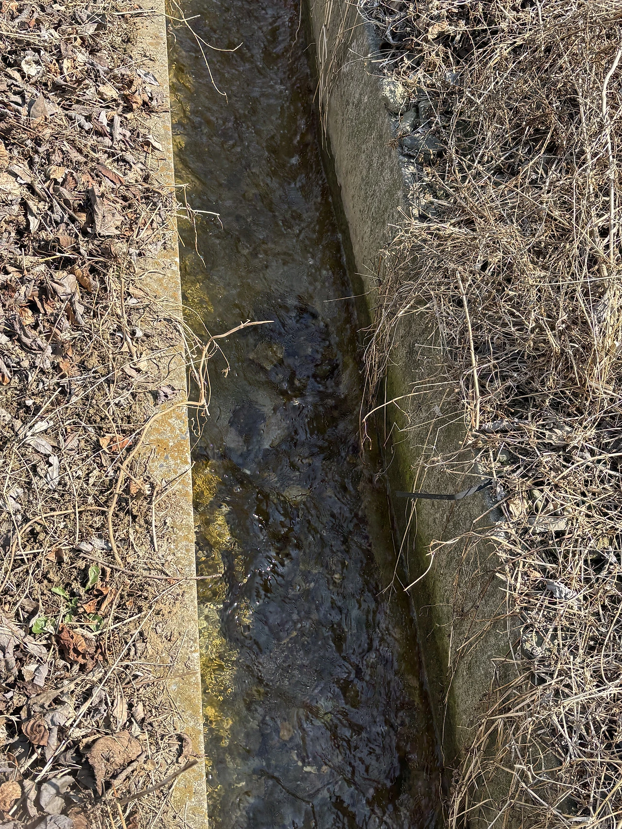 아직 갈지 않은 밭에서 검은 비닐이 나부끼고 있었다. 몇몇의 부지런한 농부들의 밭은 갈아 엎어져 벌써 양파나 마늘을 심어 가지런히 정리해 놓았다. 밭둑에는 검불들이 엉켜있는데, 농수로에는 산에서 녹아 흘러든 맑은 물이 졸졸졸 흘렀다. 자갈을 섞어 만든 시멘트 농수로 바닥의 모래가 영롱하게 비추어 보였다.