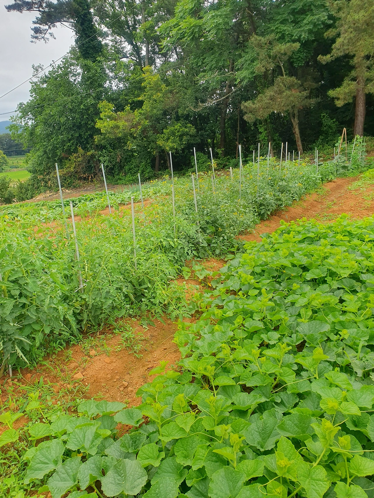 대문 앞에 빨간 열매가 주렁주렁 열려있는 보리수나무가 서 있고 주변에 무성했던 풀들이 깔끔하게 정돈되어 있다. 친구는 그동안 준비해 간 각종 씨앗과 모종을 심은 채소들이 많이 자라 흐뭇해한다. 앞밭에 심어놓은 참깨. 상추 고추, 녹두, 고구마 잎이 자란 모습을 보여주며 자랑하느라 바쁘다. 친구는 시골 오면 이런 재미도 있어야 한다며 보리수열매도 따고 상추와 고추도 싸주었다.