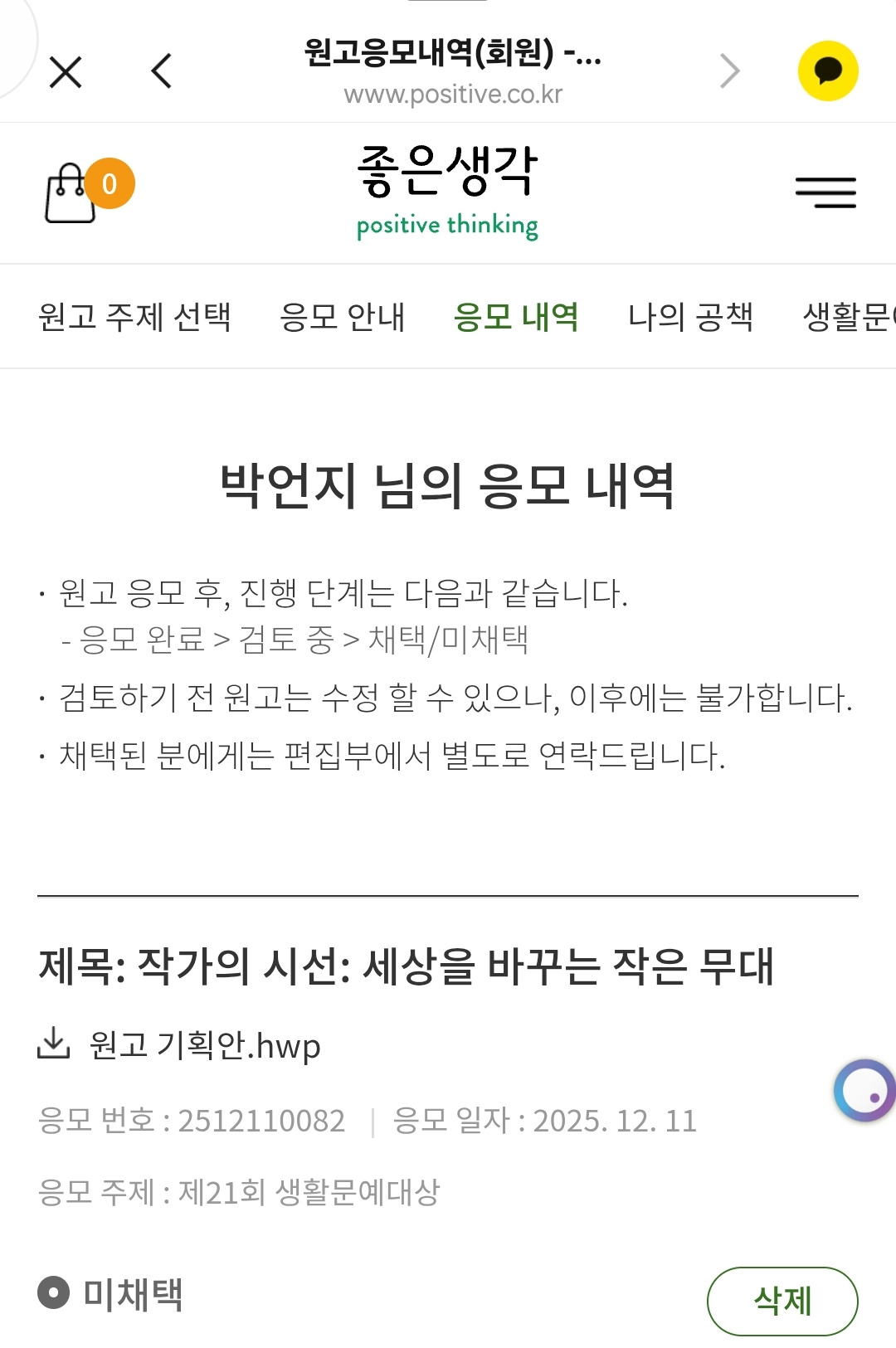 사진 속 결과지에는 제가 본명인 '박언지'로 응모했던 제21회 생활문예대상에서 미채택되었다는 통보가 선명하게 적혀 있습니다. 여기에 사실 얼마 전 라디오 작가 오디션에서도 아쉬운 소식을 접했습니다. "라디오가 안 되어도 이 공모전 하나가 남아 있으니 괜찮다"라고 스스로를 다독여 왔는데, 연이은 소식에 지금 제 마음은 아래로 톡톡톡 떨어지고 있습니다.