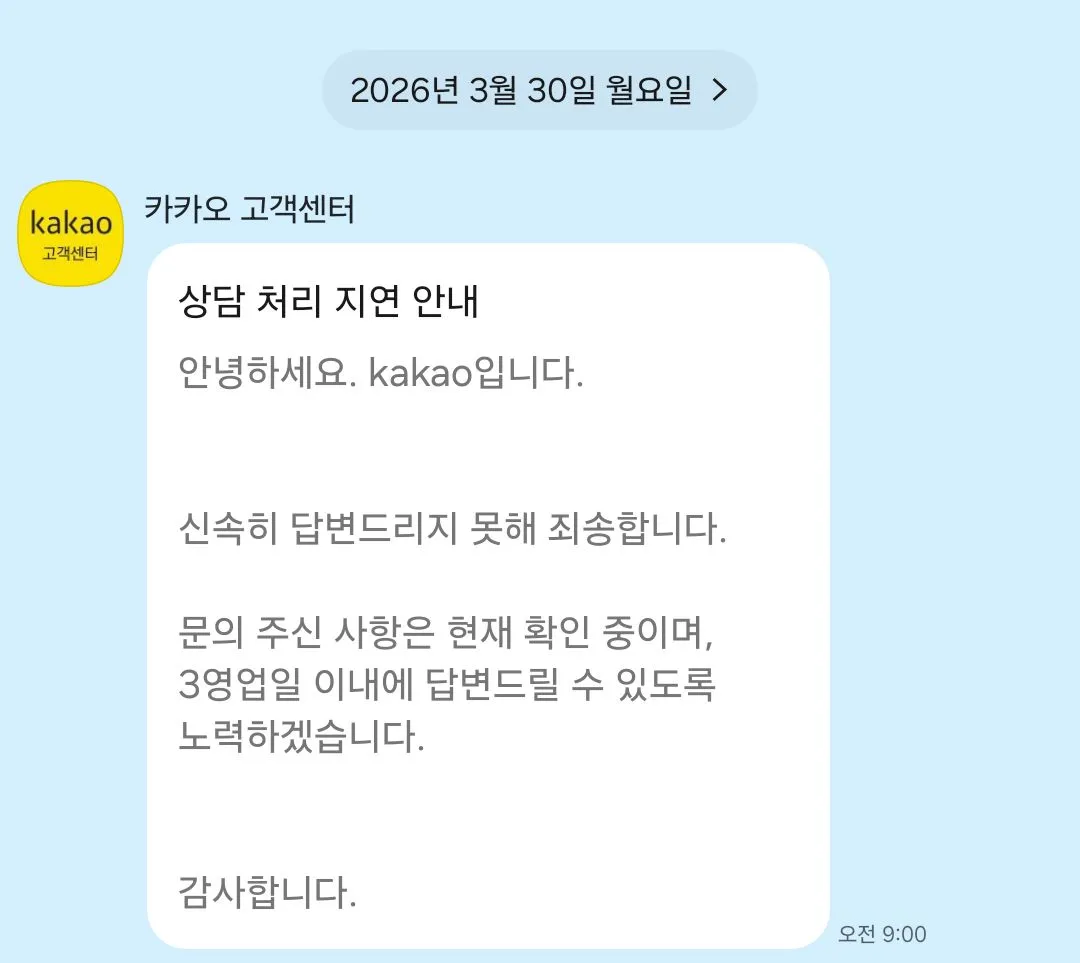 마음을 더 무겁게 만드는 상황은 계속 이어집니다. 이용 중인 서비스의 불편함으로 카카오톡 고객센터에 문의를 남겼으나, 돌아온 것은 답변을 미루고 있다는 지연 안내뿐입니다