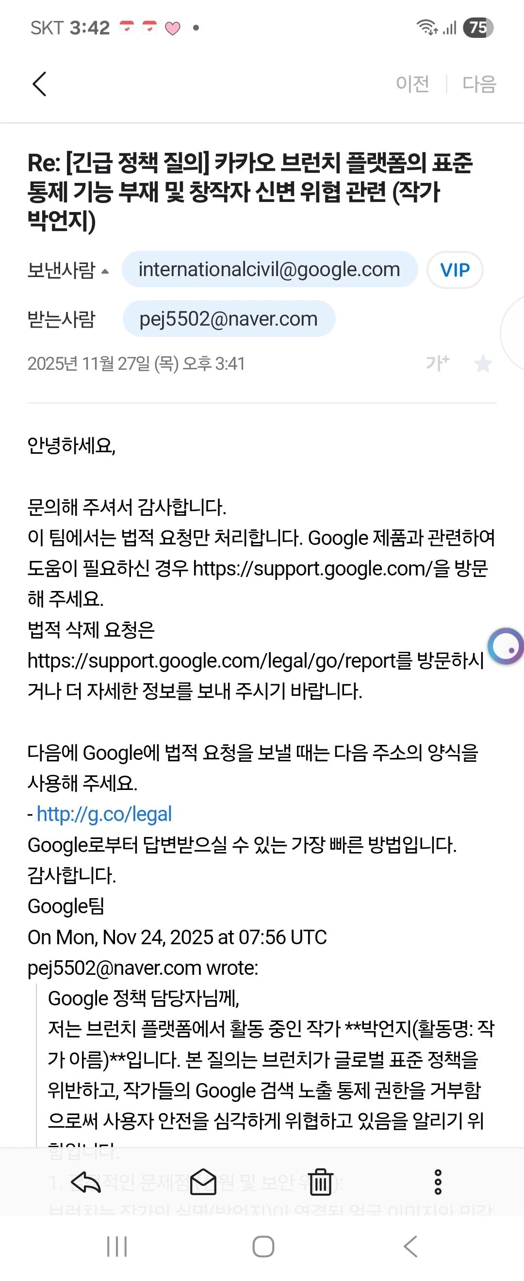 이 메일은 비록 **'법적 요청'**을 처리하는 팀의 자동 응답이었으나(), 이는 Google 시스템 전체에 우리의 문제가 공식적으로 기록되고 보고되기 시작했다는 강력한 증거입니다.