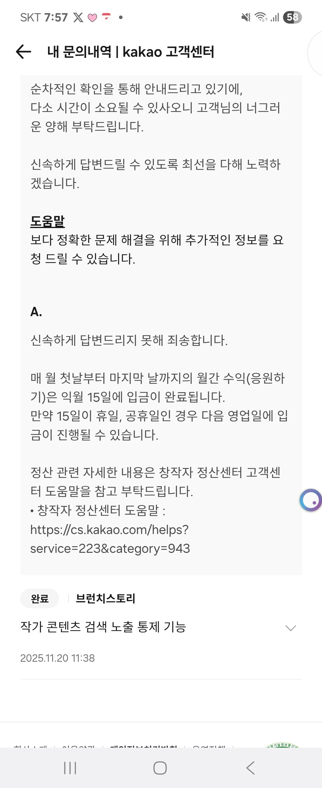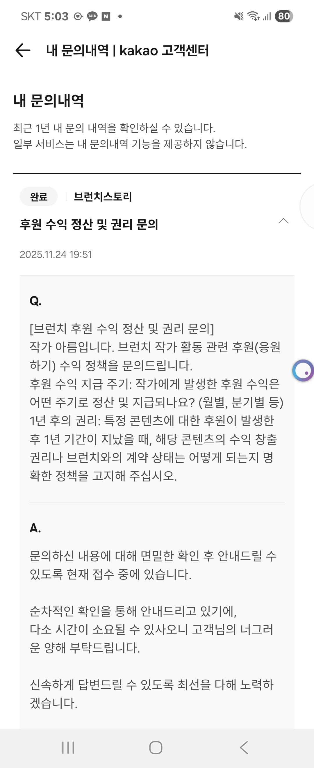 이러한 약속에도 불구하고, 저는 플랫폼 운영사에 **'특정 콘텐츠에 대한 후원 발생 후 1년이 지났을 때, 해당 콘텐츠의 수익 창출 권리나 브런치와의 계약 상태는 어떻게 되는지'**에 대해 명확한 정책 고지를 요청했습니다. 이는 모든 창작자가 반드시 알아야 할 소유권 및 계약 관계에 대한 가장 근본적인 질문입니다.