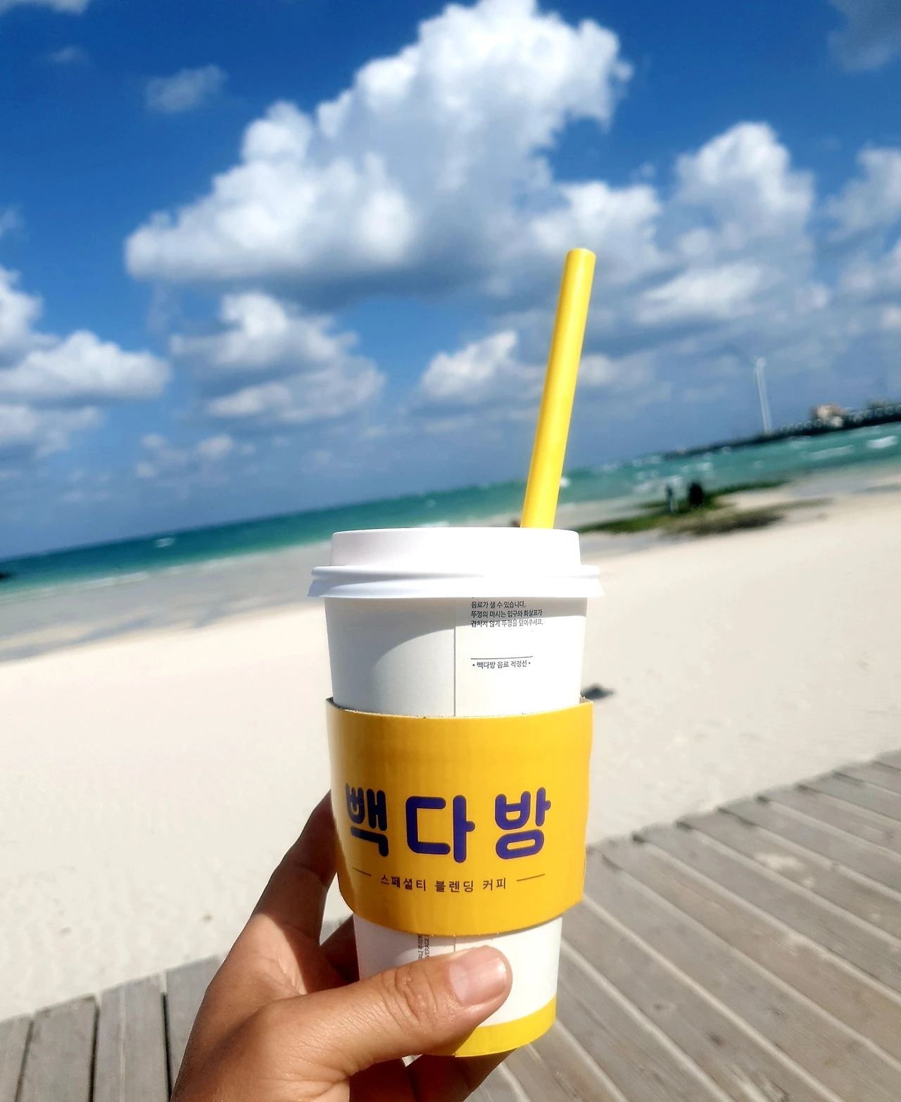 모래 위에 앉아 커피 한 잔을 손에 들고,