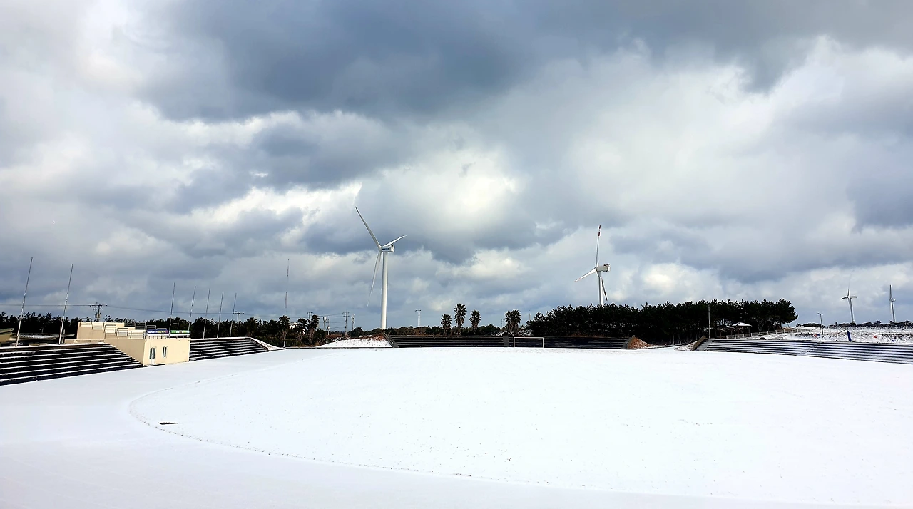 하얗게 눈 덮인 운동장에