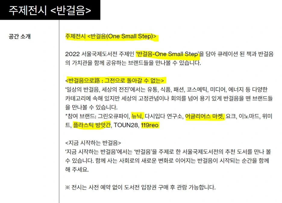 아무쪼록 내가 알고 있는 다양한 브랜드 외에도 이 도서전에도 선한 분위기를 재창조하기 위해 후원과 참여를 해주었다는 점은 실로 엄청나다. 간접적이나마 이 공간형 특별 전시를 구경하니 어느덧 30분이 지났고, 마침내 곳곳에 있는 이 '반걸음'이 무엇을 설명해 주려고 하는지 도슨트와 다양한 책을 구경하였다.