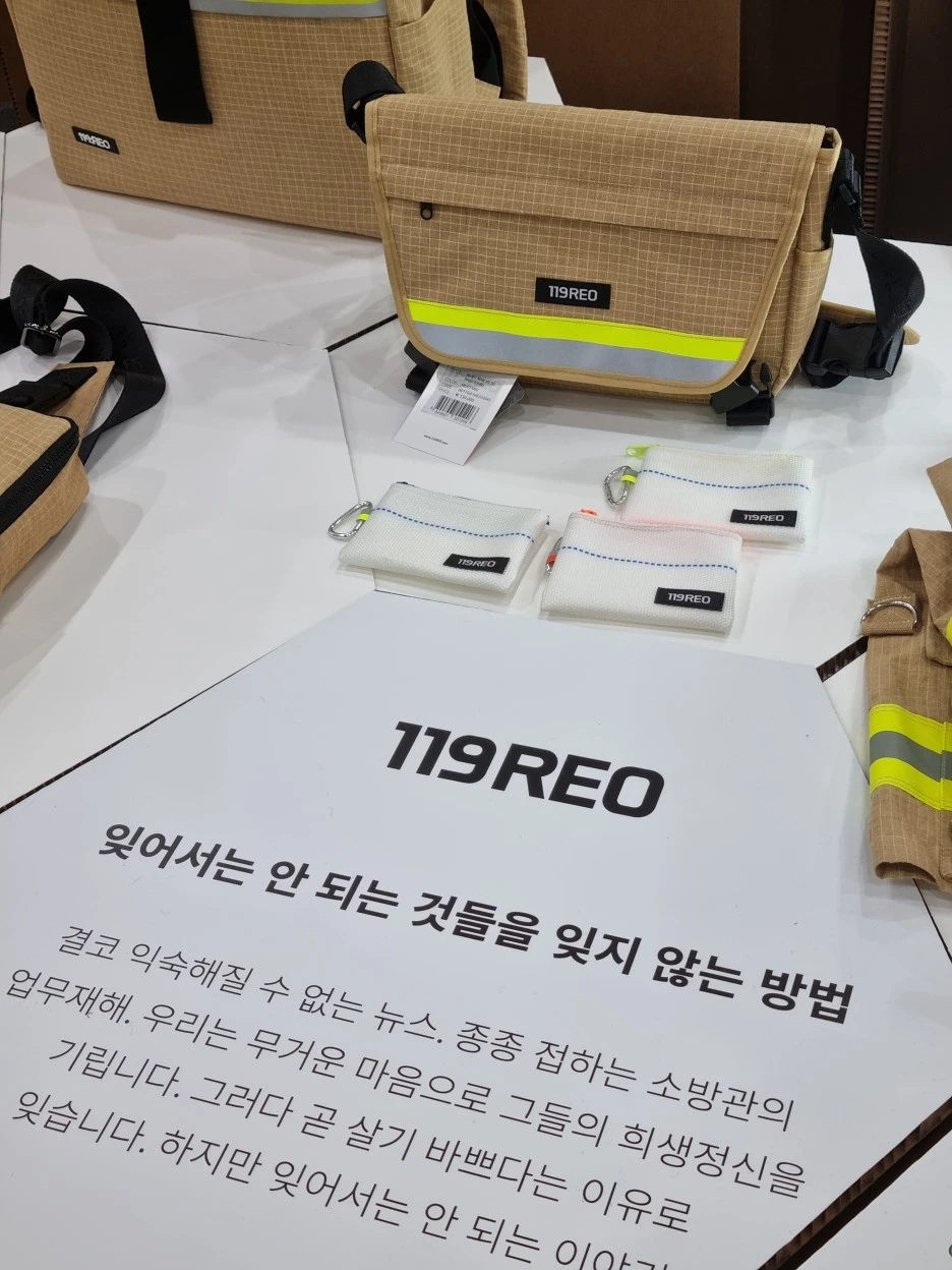 그리고 '플라스틱 방앗간'이 있는데 참고로 오늘 이 글을 기록하는 날은 바로 6월 5일, 즉 '환경의 날'에 맞춰서 다양한 봉사 여건과 세계적 선한 영향력을 제공하기 위해 참여했음이 분명하다. 환경의 관점을 담은 서적뿐만 아니라 곳곳에 보이는 다양한 플라스틱 용구와 병뚜껑을 활용한 업싸이클링(Up-cycling)제품을 선보였다. 잠깐 도서 구경도 좋지만 마음 편해지는 그들의 노고가 내 눈에 선해지는 게 보였다. 참으로 신기했다. 마지막으로 119reo는 '소방사 공무원'을 위해 선한 영향력을 펼치는 단체이다. 그들의 선한 움직임은 정말 신선했다. 우리가 흔히 알고 있는 피땀 서린 출동 현장 옷에 실용성과 편의성을 붙여 디피했다는 점이었다.