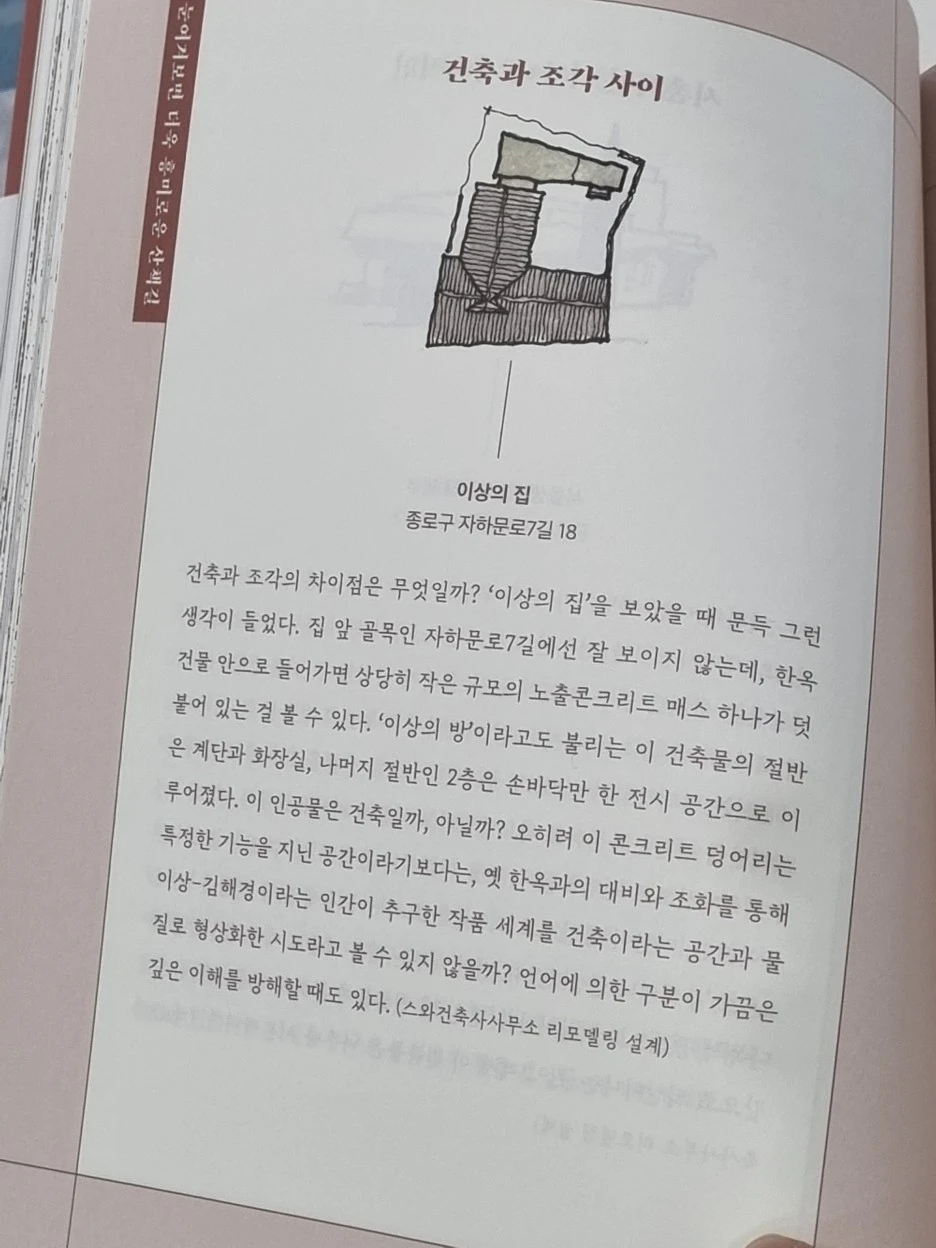 서촌 마을은 Y자로 된 골목이 많다. 그 말인즉슨, 인위적인 상권을 위한 동네가 아니었음을 이야기한다. 누군가가 살았을 흔적이 이 자리에 대변하고 있다는 뜻인데 그 주변 길모퉁이 건축물들은 깊은 고민에 의한 결과물로 보이지 않는다는 의미는 어느 정도 납득이 된다. 지금도 여전히 옥인길 자락을 거닐다 보면 이런 구조를 볼 수 있다. 하지만 관광객의 유입으로 인해 이러한 형태의 건축물은 전시회로 운영하기로 했다. 그 이유는 사람들의 유입이 많아지니 사적 공간 개입이 점점 극대화되었기 때문이다.