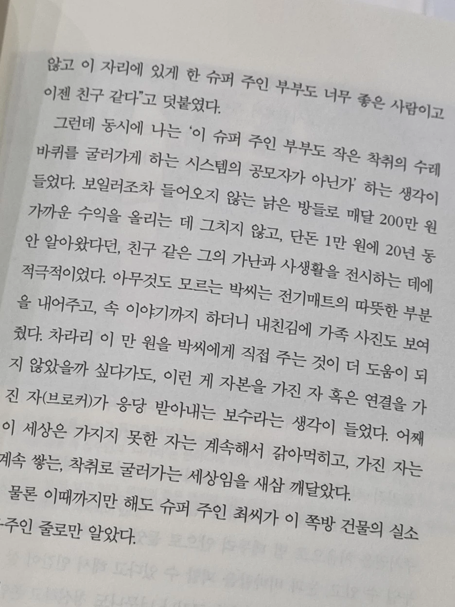 어째 이 세상은 가지지 못한 자는 계속해서 갉아 먹히고, 가진 자는 계속 쌓는, 착취로 굴러가는 세상임을 새삼 깨달았다.