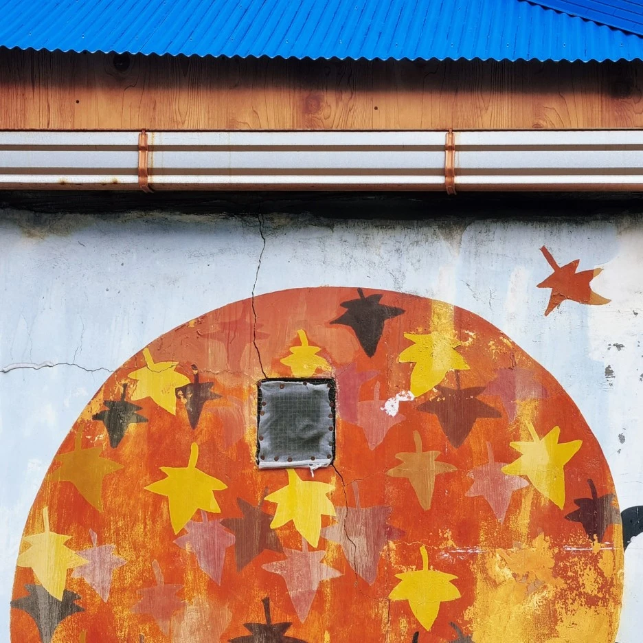 동래슈퍼 근처 벽화, 단풍잎이 떨어지는 모습이 인상적이다. 마치 마을의 미래를 대변하듯이.