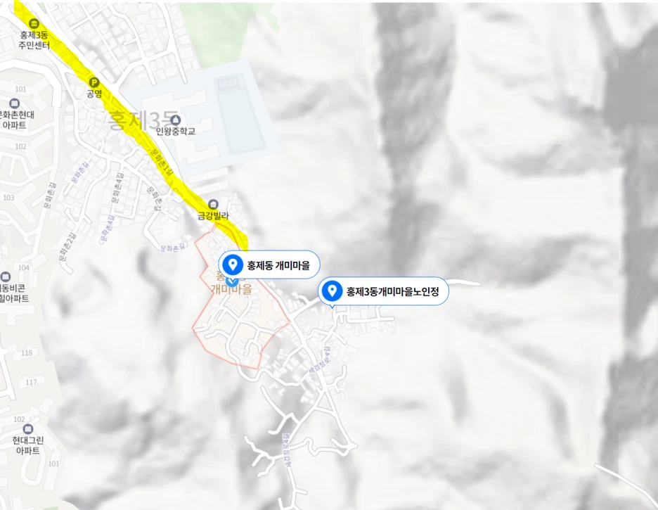 정확한 위치로는 인왕산 자락에 위치한 판잣집 마을이다. 정말 홍제 3동 주민센터에서 500보 이상 올라가야 마을이 등장한다.