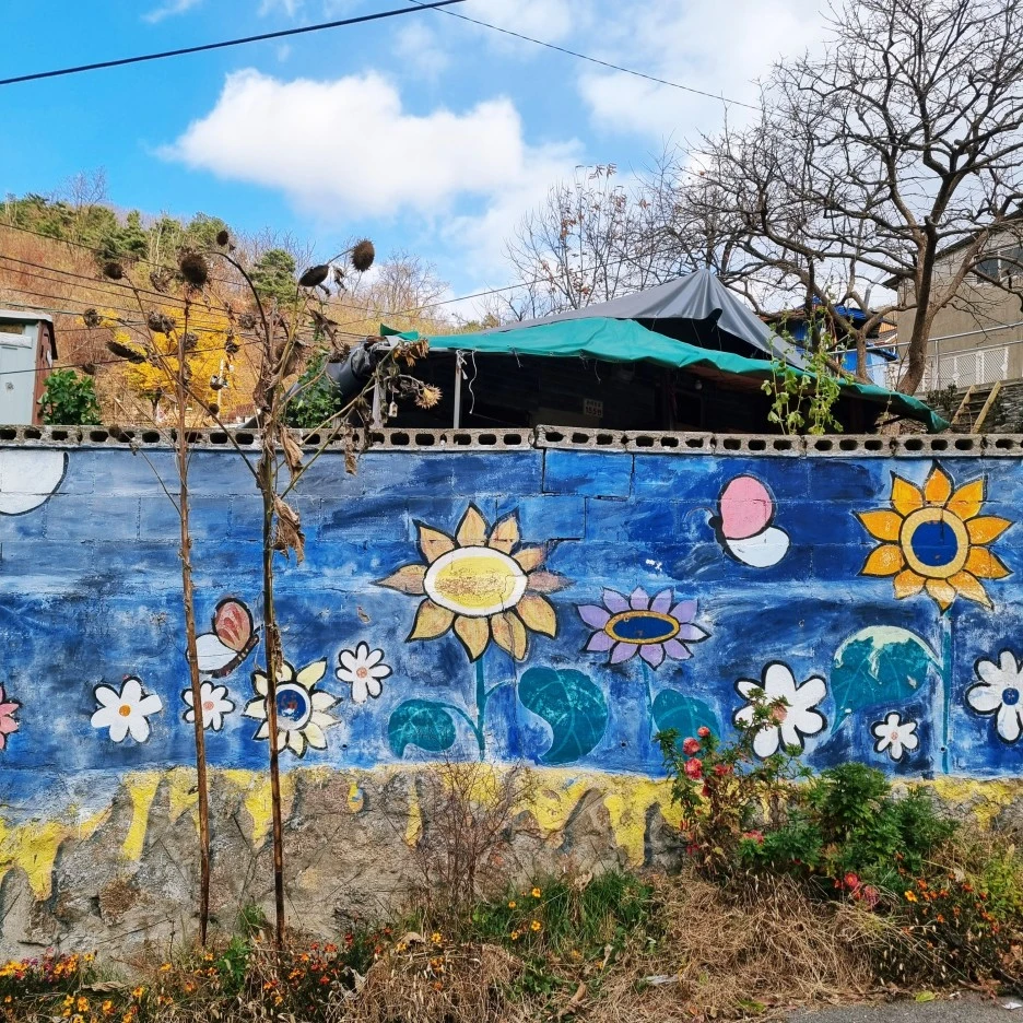 소소한 레트로 감성의 벽과 화려한 꽃잎 무늬가 자리 잡힌 소소한 동네.