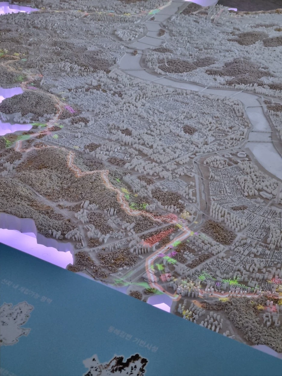 빨강, 노랑, 초록, 파랑의 4가지 버튼이 있는데 그 중 한 개를 누르면 서울이 가지고 있는 자연적인 경관과 지리적 굴곡을 보여준다. 예를 들면 빨강을 누르면 서울의 산맥이 보드지 위에 빨갛게 뿌려지며, 노랑 버튼을 누르면 서울의 여러 하천까지 보여준다. 신기하게도 내가 알던 하천을 제외한 이름 모를 도랑과 내천 등등, 예전 조선시대 한양에서 언급된 갖가지 하천들이 표현된다. 그 증거는 조선의 유명한 실학자 이중환이 조선을 현지답사하여 만든 지리서인 '택리지'에서 근거한다. 그 외로 다양한 버튼을 누르면 산맥에서 흘러나오는 기류와 수맥, 물줄기 등등 평소에 서울이라는 공간에서 미처 느끼지 못했던 다양한 실험 정신을 가시적으로 보여주더라.