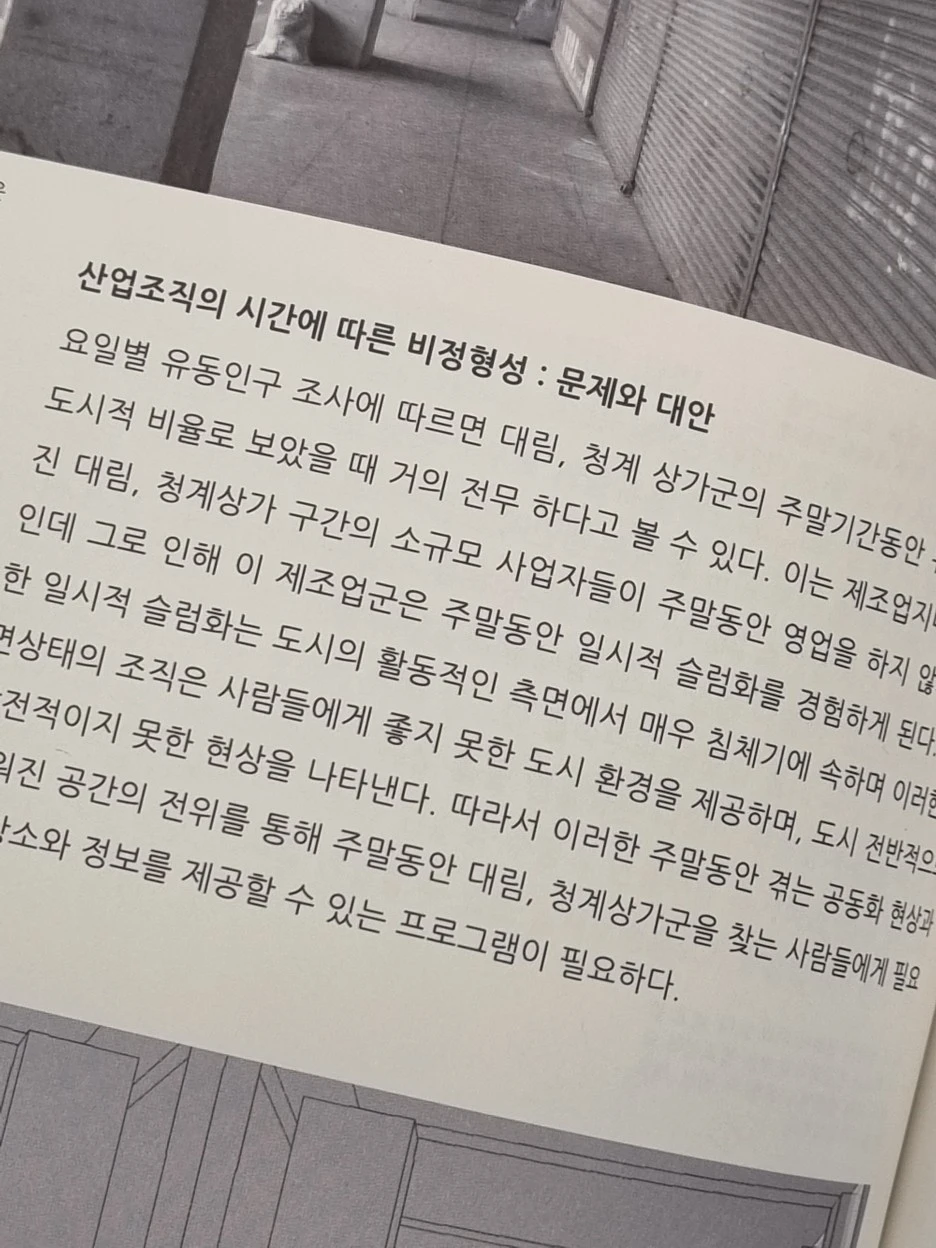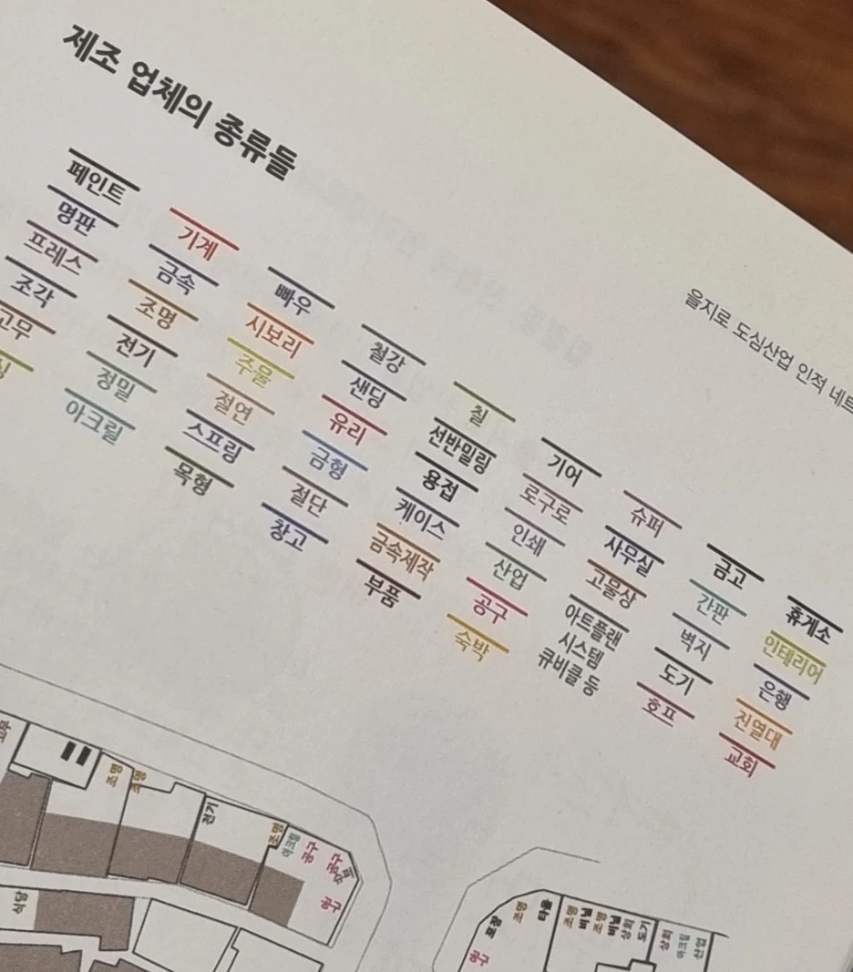 우리가 흔하디흔한 이케아 비스름한 가구용 재료, 인테리어 요소들은 대부분 중구와 남대문 시장 일대에서 제작된다. 지금 내가 보고 있는 이 업체들은 대부분 그 부류에 속한다. 검은색으로 획정된 구역 안에서 각각의 제조 업체들이 어떠한 일을 하며 생계업을 이어갈지 저자는 12시간 넘게 현장을 둘러 다니며 이 거리를 지켜보았다고 한다.
