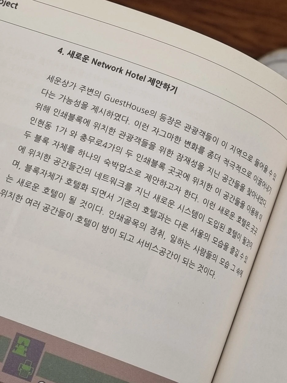 이런 자그마한 변화를 좀 더 적극적으로 이끌어내기 위해 인쇄 블록에 위치한 관광객들을 위한 잠재성을 지닌 공간들을 찾아내었다. 인현동 1가와 충무로 4가의 두 인쇄 블록 곳곳에 위치한 이 공간들을 이용해 이 두 블록 자체를 하나의 숙박업소로 제안하고자 한다. 이런 새로운 호텔은 곳곳에 위치한 공간들 간의 네트워크를 지닌 새로운 시스템이 도입된 호텔이 될 것이며, 블록 자체가 호텔화되면서 기존의 호텔과는 또 다른 서울의 모습을 즐길 수 있는 새로운 호텔이 될 것이다. 인쇄 골목의 정취, 일하는 사람들의 모습 그 속에 위치한 여러 공간들이 호텔이 방이 되고 서비스 공간이 되는 것이다.
