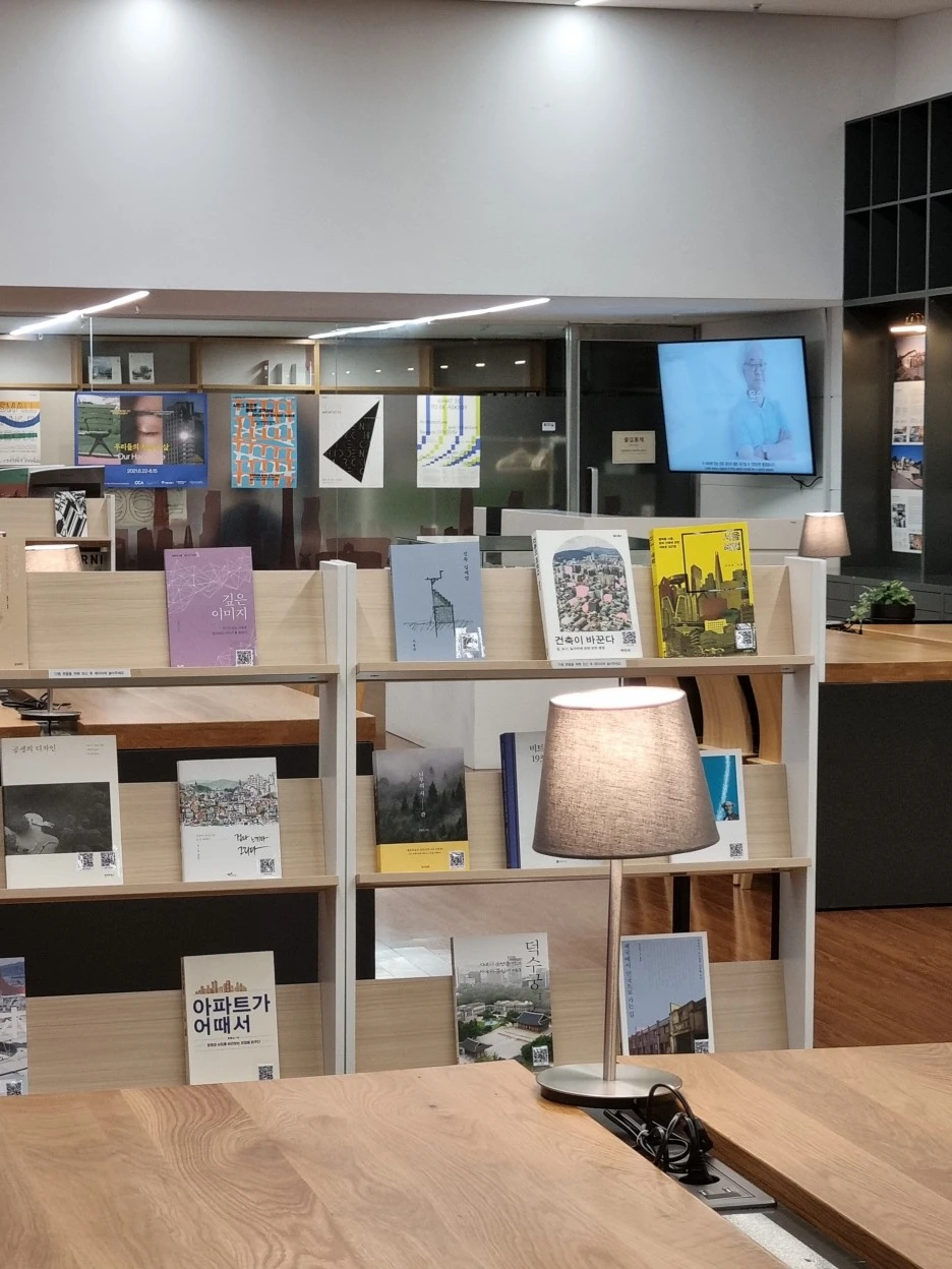 그 옆으로 ㅁ모양의 4평 남짓한 기다란 직사각형 공간구조가 있는데 각 면마다 재개발, 도시재생, 근대건축물, 건축 모형물 등 다양한 주제를 화제로 담고 있는 책들이 꽂혀져 있었다. 난 그중에서 을지로 관련 재개발 책을 덥석 들고 골뱅이 나선형 의자에 앉아 읽기 시작했다.