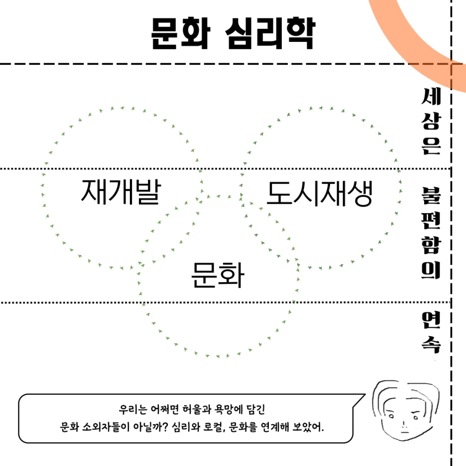 만유인력의 법칙이 있다.서로 끌어당기는 중력의 법칙 중 하나이다. 문화 또한 그렇다. 어떤 문화가 나오면 정치와 연계되어 있다. 여당과 야당의 합작품이 문화일지도 모르지만 누군가는 49 : 51의 승리자가 될 수도 있고, 패배자가 될 수도 있다. 그 1프로라는 비중은 종이 한 장 차이이지만 문화 사각지대 앞에서는 누구도 평등과 공정을 외치되 절대 불가하다는 기로에 놓인다. 미는 힘과 잡아당기는 힘은 흔히 사람 관계뿐만 아니라 공간에도 부여된다. 같이 있다는 그 장소와 상황을 마주하는 모든 현대인들은 감히 내가 스스로 행복하거나 불행하다고 스스로 외치지 않는다.