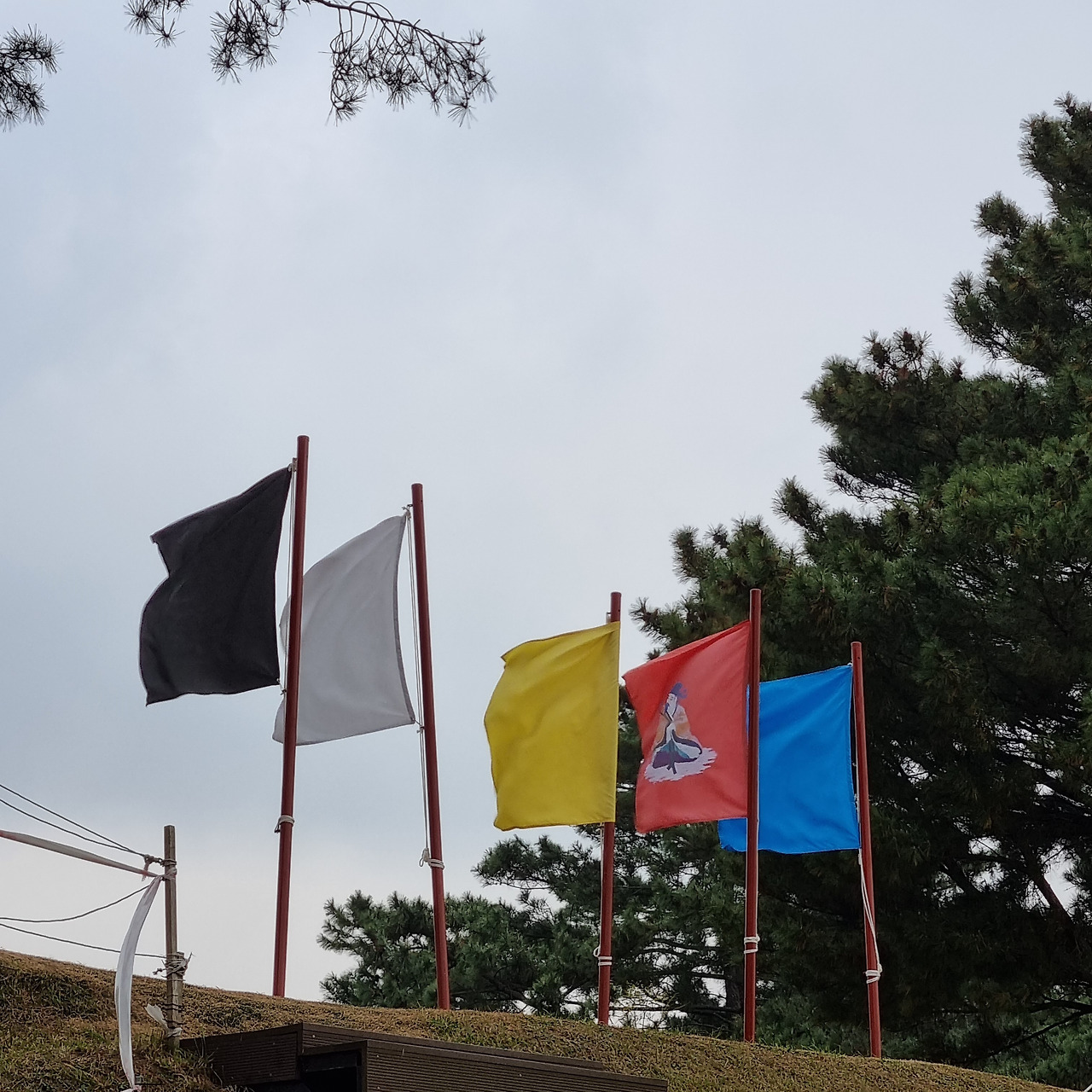 아까 올레길 올라오면서 봤던 깃발들이 있다. 궁금해서 리써칭해보니 당시 고려군들의 마스코트라고 한다. 색깔별로 음양오행설을 의미한다고.