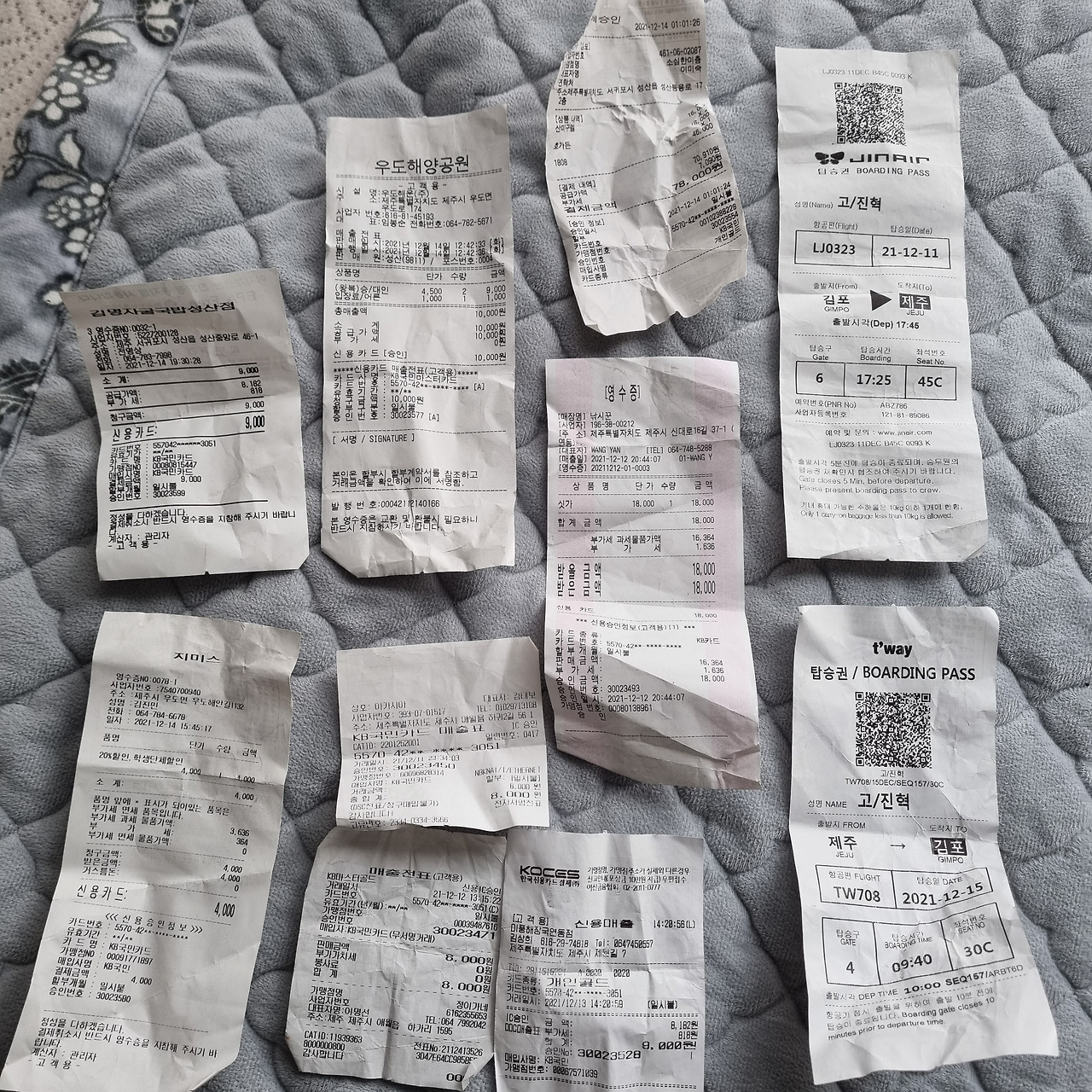 그리고 집에 도착하자마자 제주도에서 사용했던 영수증을 정리해 보았다. 이 수많은 추억의 영수증은 이제 코팅, 박제하여 하나의 갓혁의 기록물로 유산을 남겨줄 것이다.