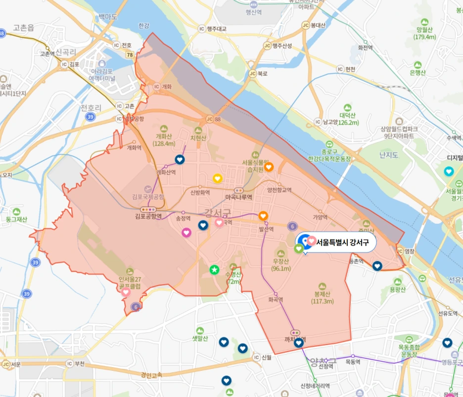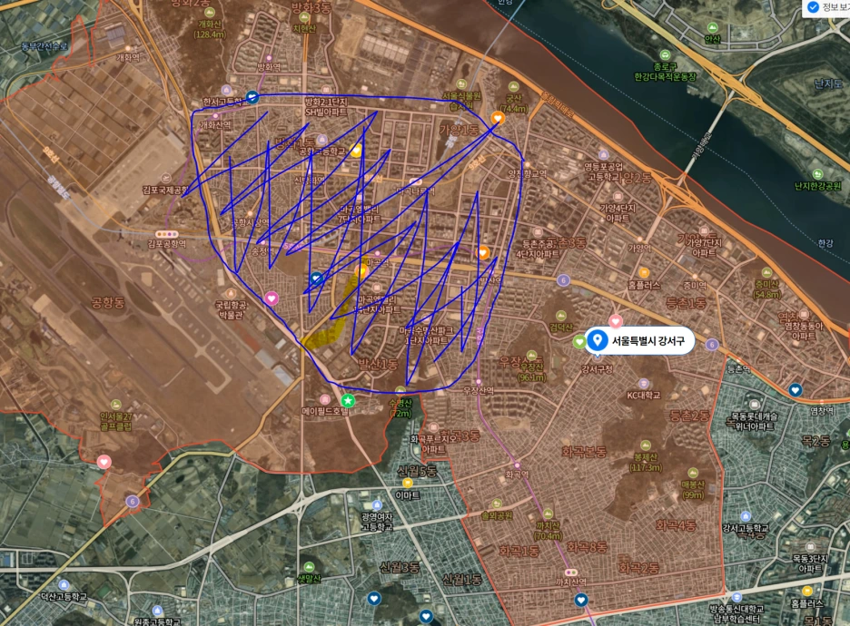 파란색으로 칠한 부분(김포공항~방화동-공항동-마곡동-발산동 일부 포함)