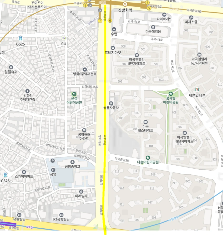 제가 2010년대 초에 고등학생이었습니다. 인근에는 울창한 수풀과 논밭에 거름을 피우고 있는 농촌 마을을 고스란히 유지한 마을이었지요. 한때 일산에 사는 친구가 강서구로 놀러 온 적이 있었는데 그 당시 한강을 건너 발산역을 거쳐야 하거든요. 그런데 발산역 근처에서 밥을 먹으며 피시방에 놀러 갈 때 친구가 하는 말이 아직도 잊히지 않네요.