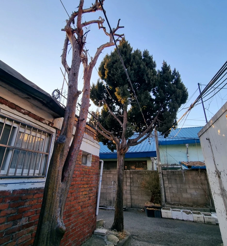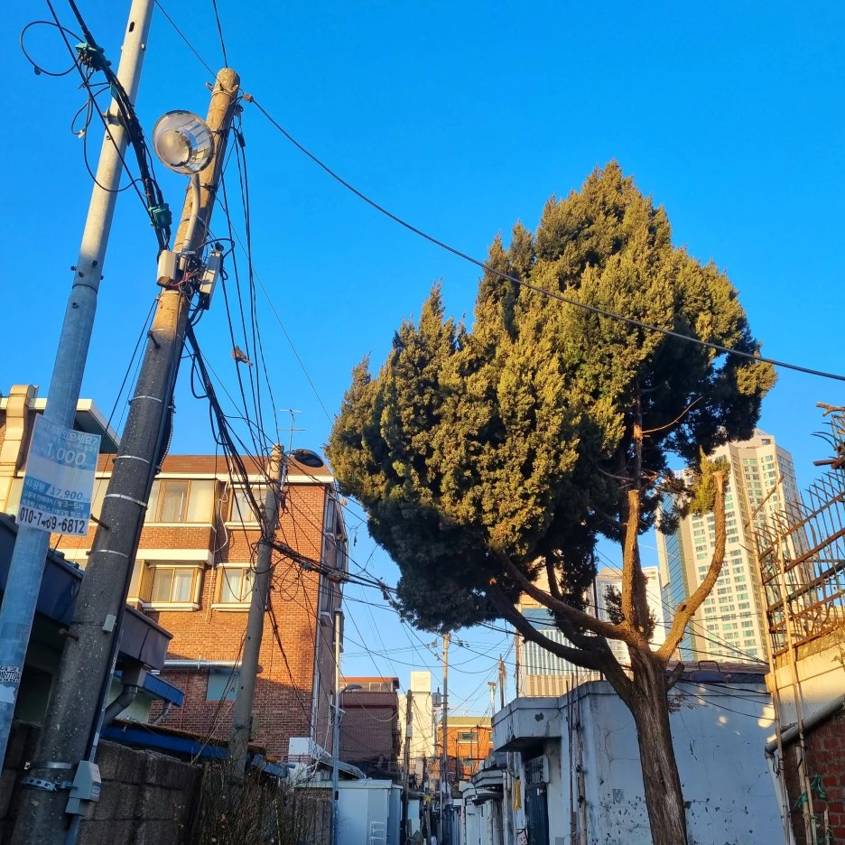 골목 모퉁이에 자리 잡은 이름 모를 왕따 나무